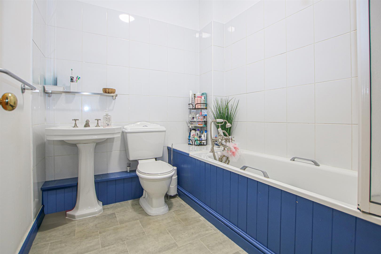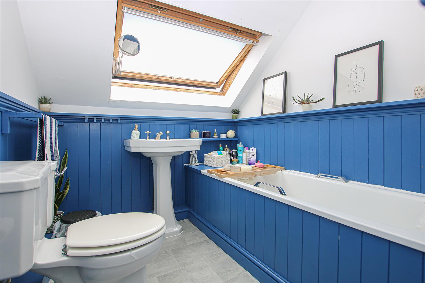 With white suite comprising of panelled bath, pedestal hand basin, low level wc. Skylight and airing cupboard.