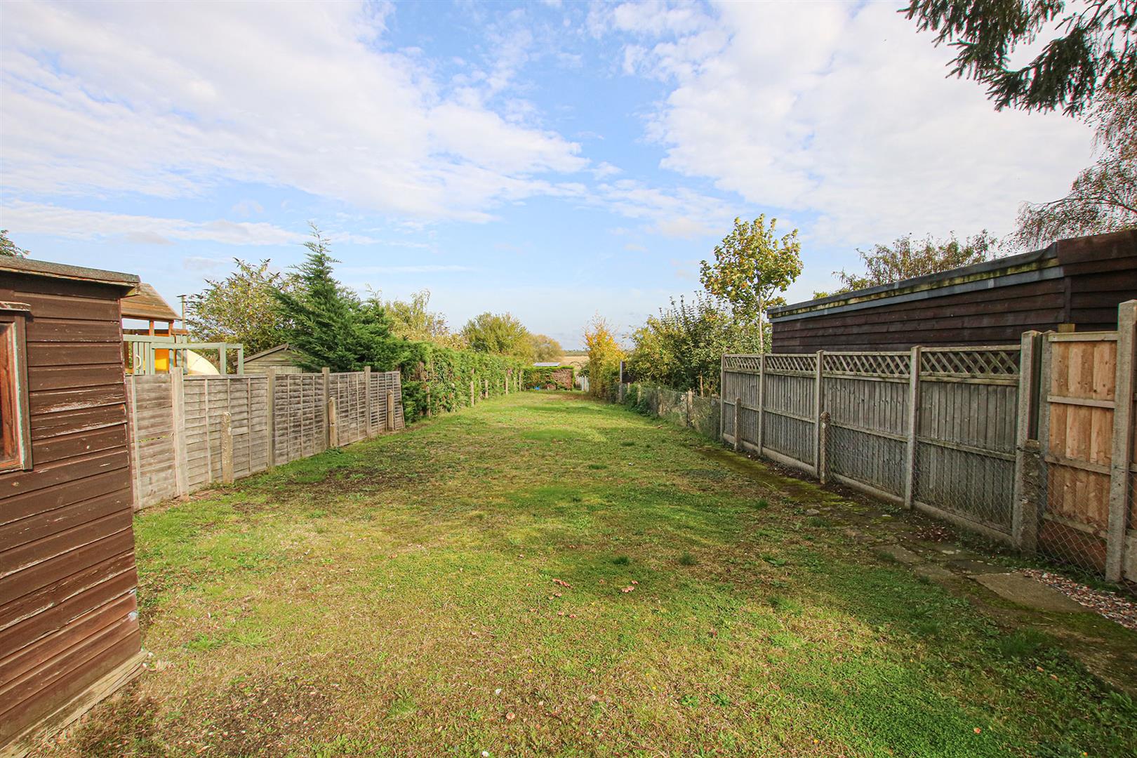 The property occupies a generous plot with a long rear garden that enjoys open views over fields. Additional highlights include a detached garage, a versatile outbuilding with electricity, and ample off-road parking.