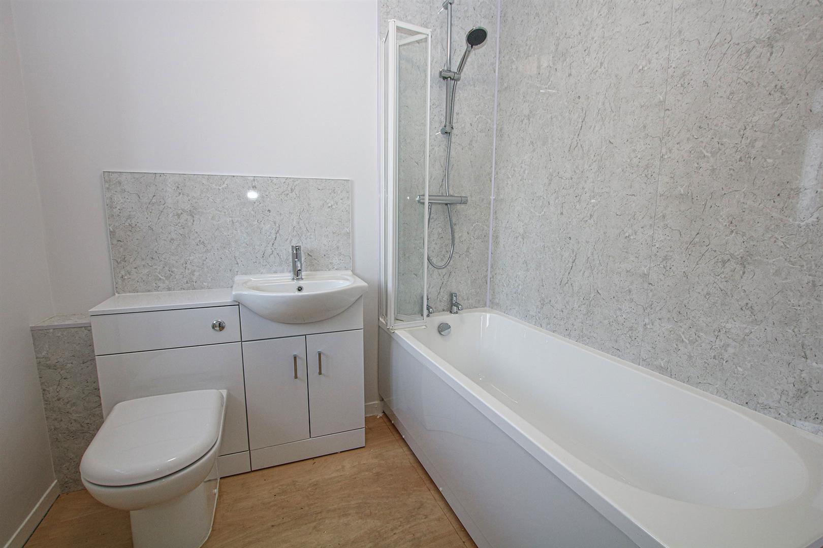 Modern bathroom with white suite comprising low level W.C. with hidden cistern, inset hand basin with mixer tap over and built-in storage under and panelled bath with wall mounted shower over and bi-folding glass screen. Attractive marble effect panelling to wet areas. Obscured window.