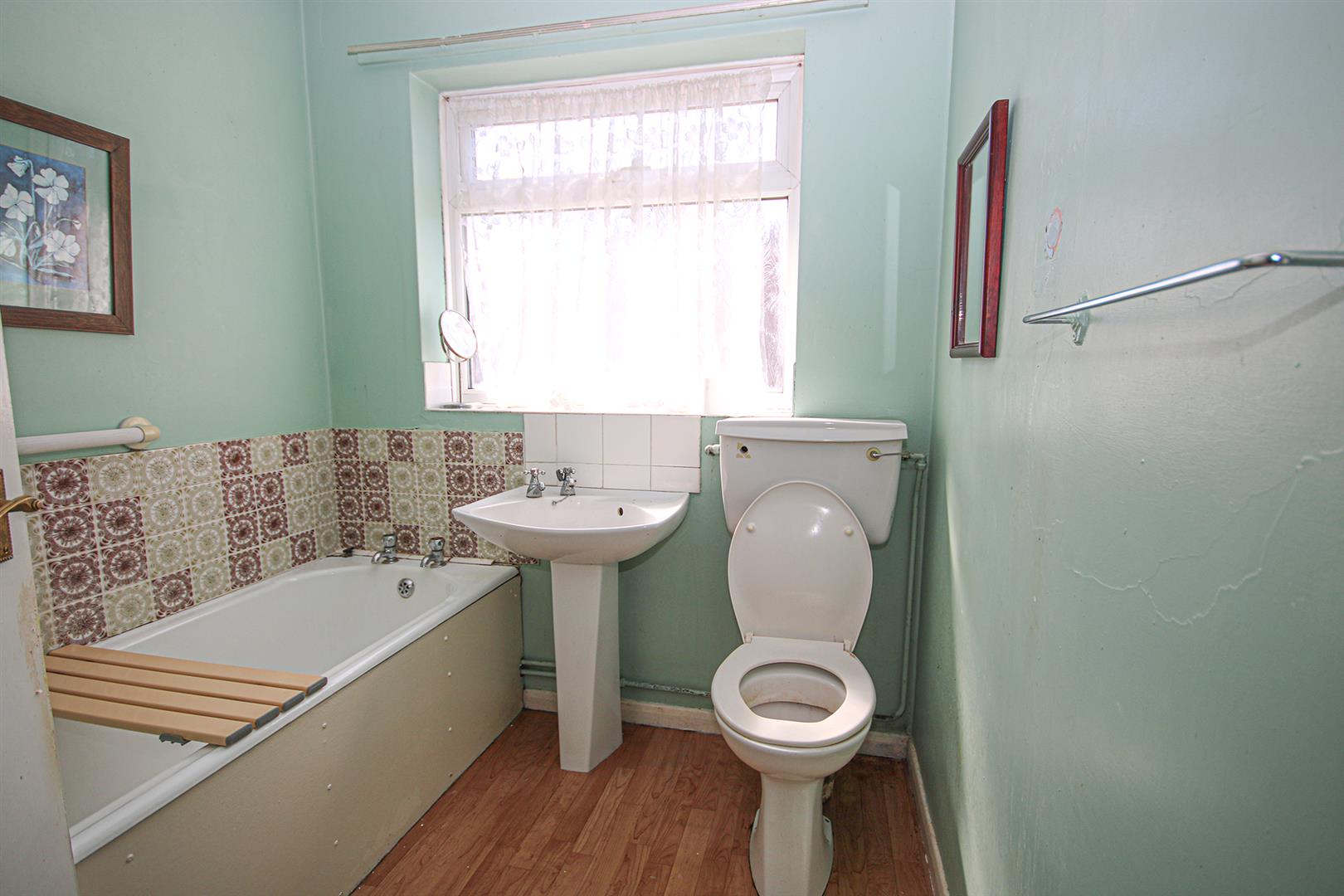 White suite comprising W.C., pedestal hand basin with taps over and panelled bath. Radiator. Obscured window. Door to entrance hall.