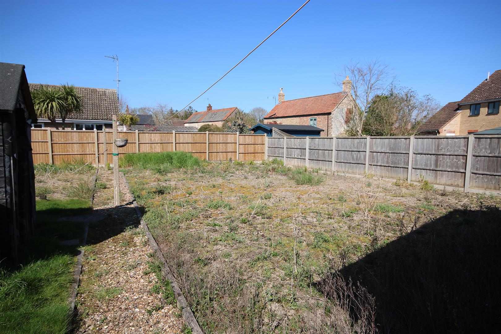 Spacious rear garden mainly laid to lawn with central pathway. Entrance door to bedroom 3.