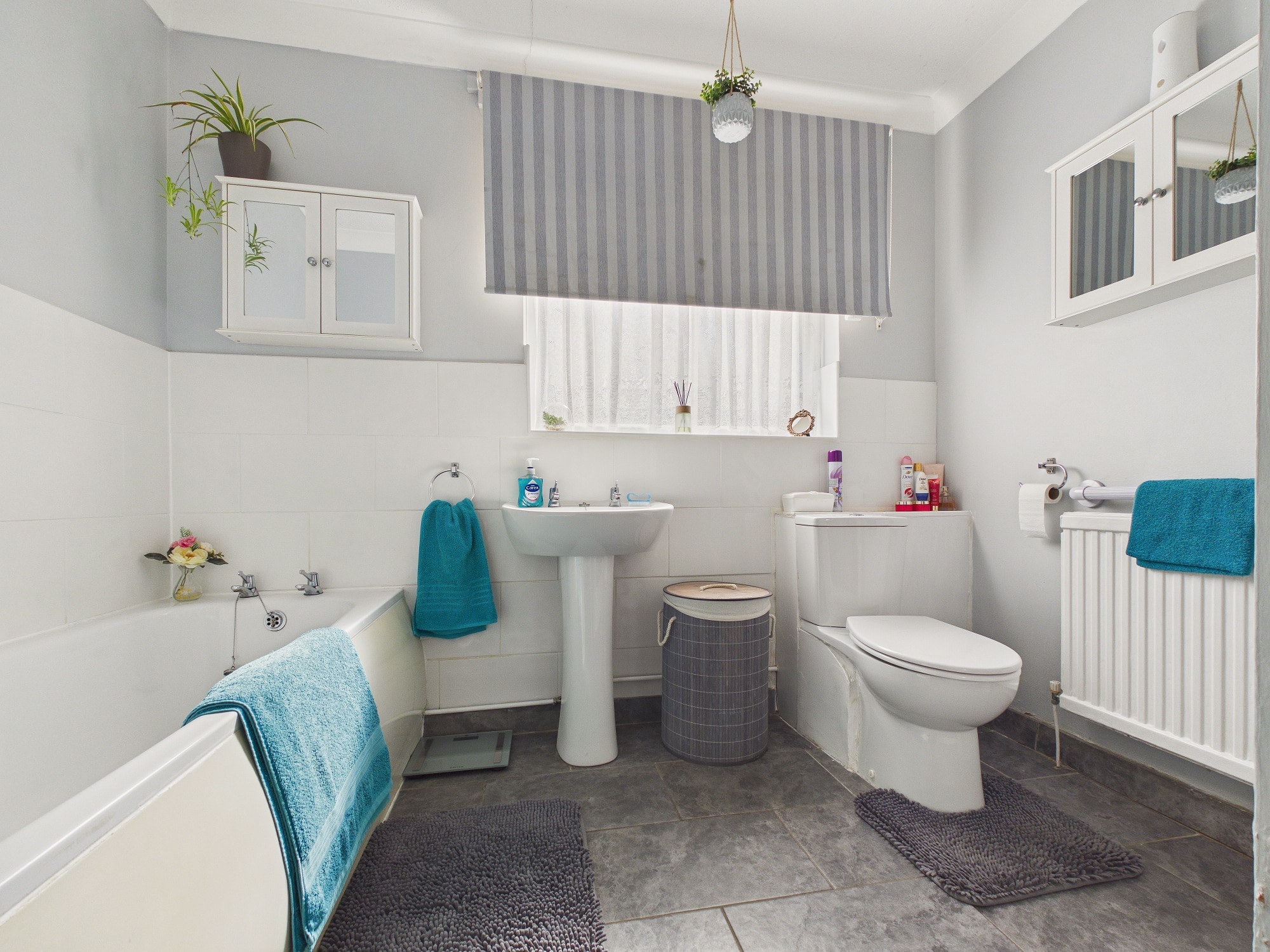 uPVC double glazed window to side, wall mounted double panel radiator, panelled bath, corner shower cubicle, w.c., pedestal handwash basin, tiled flooring, textured and coved ceiling.