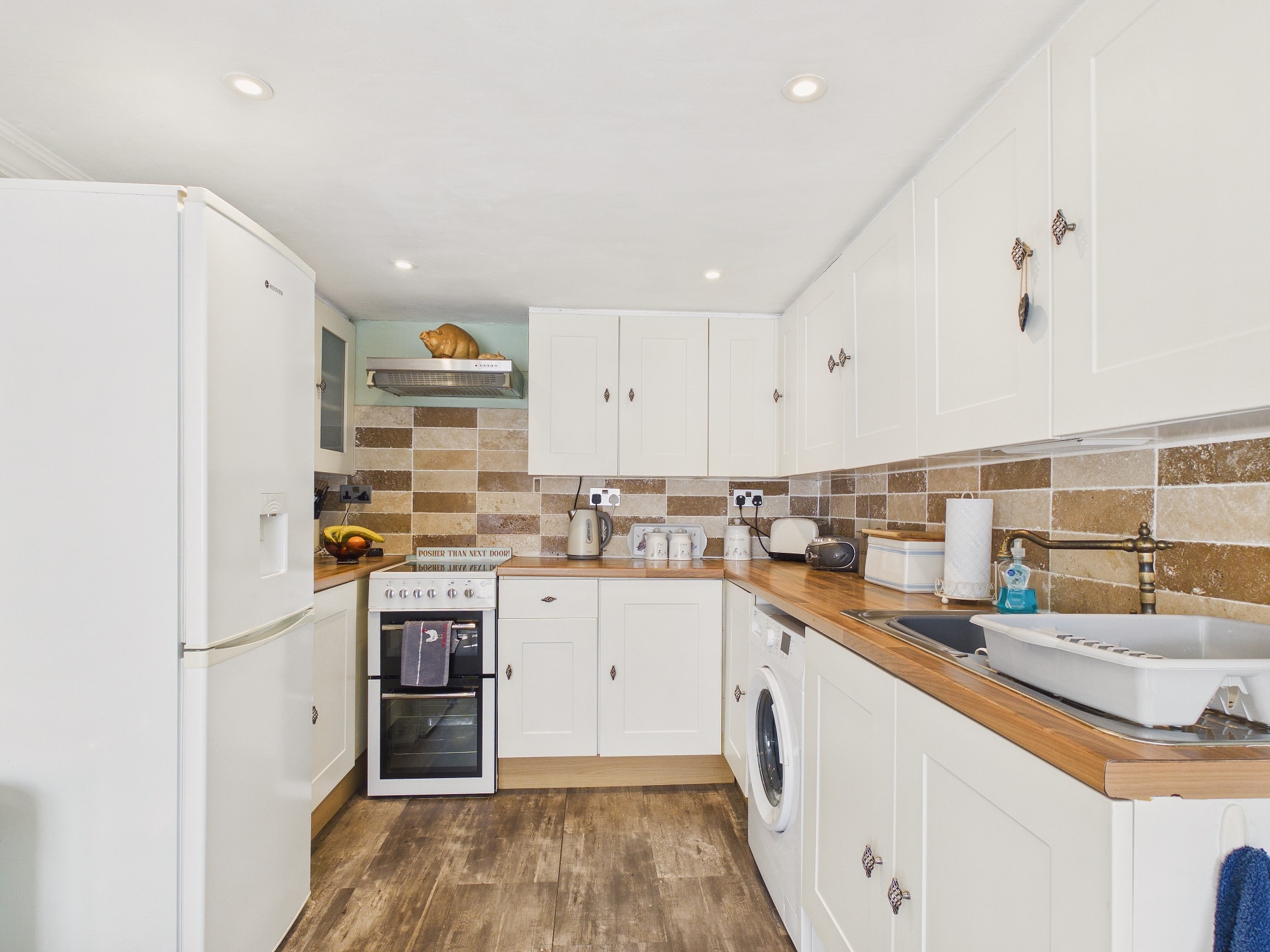 uPVC double glazed window and uPVC double glazed door to front, wall and base units under round edge worksurfaces, stainless steel sink drainer inset with mixer tap over, free standing electric oven and hob with extractor over, space for washing machine and fridge/freezer, lino style flooring, coved ceiling with spotlights.