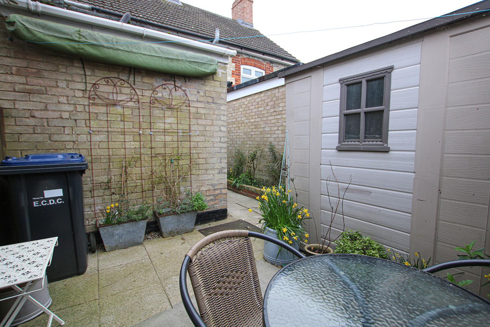 Charming courtyard garden with a retractable patio awning. PVC shed. Side access gate.