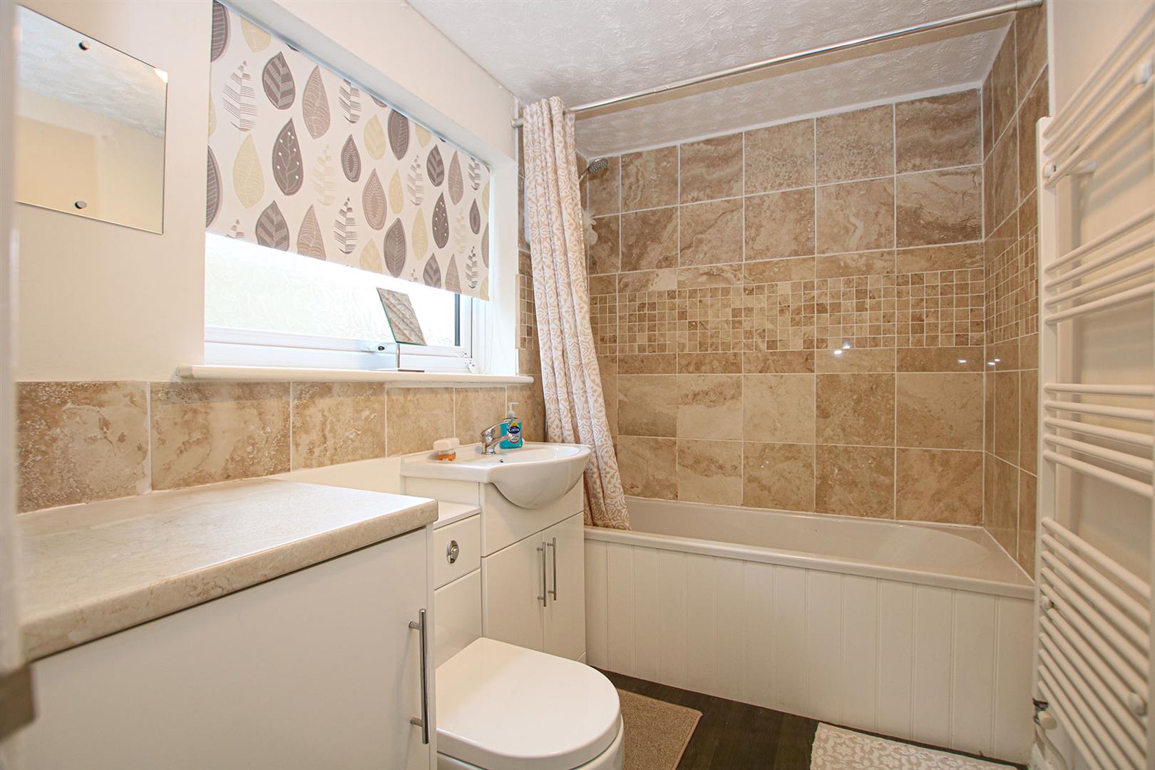 Contemporary white suite comprising low level, concealed cistern, W.C., inset handbasin with mixer tap over and panelled bath with wall mounted electric shower over. Built-in base storage units with counter work tops. Attractively tiled. Obscured window. Ladder radiator. Door leading to the rear hallway.