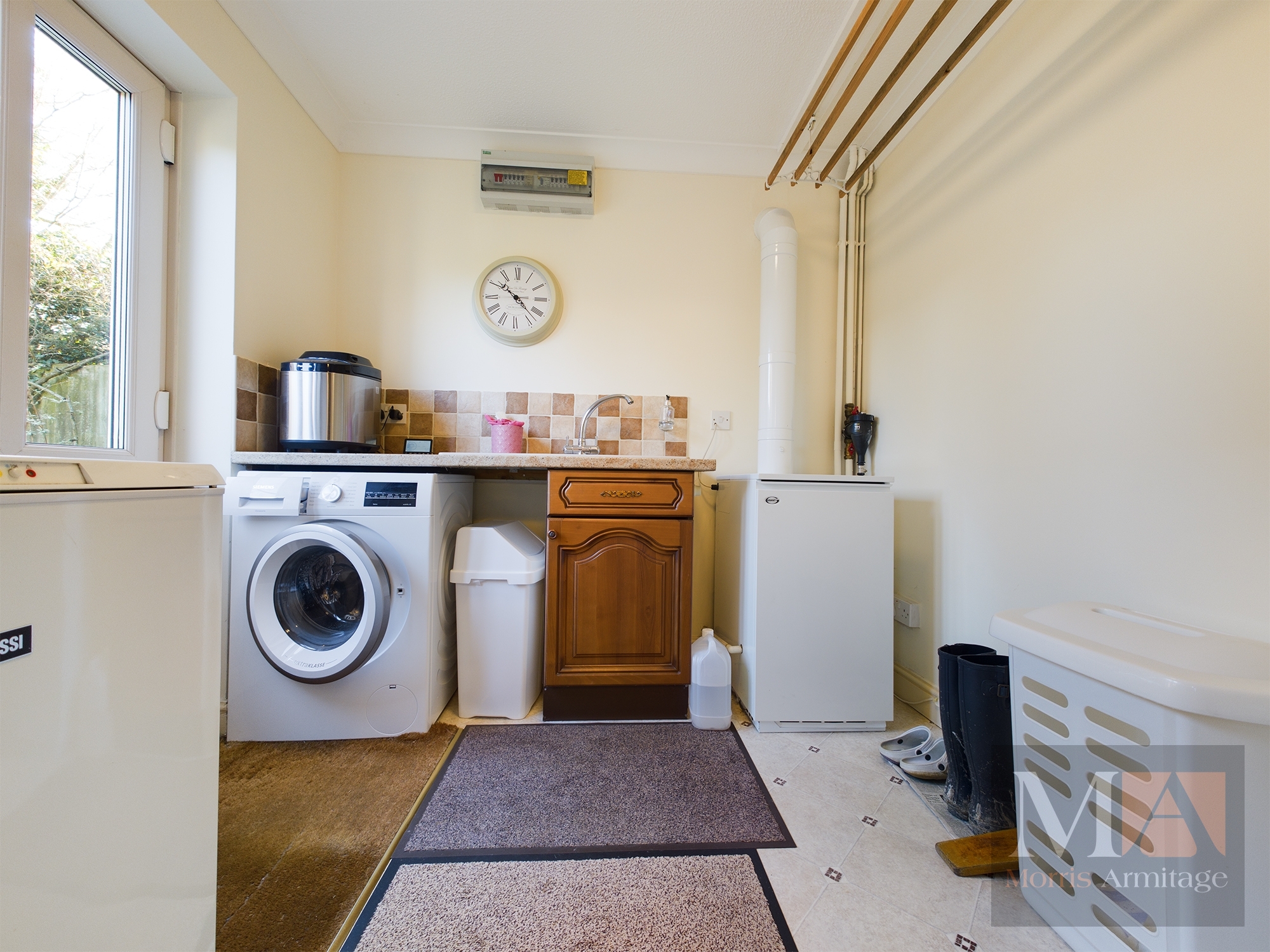 Triple glazed window and access door through to the rear, work surface with inset composite sink and mixer tap, matching storage units, space for appliances, floor mounted oil fired central heating boiler, coved ceiling, tiled splashbacks.