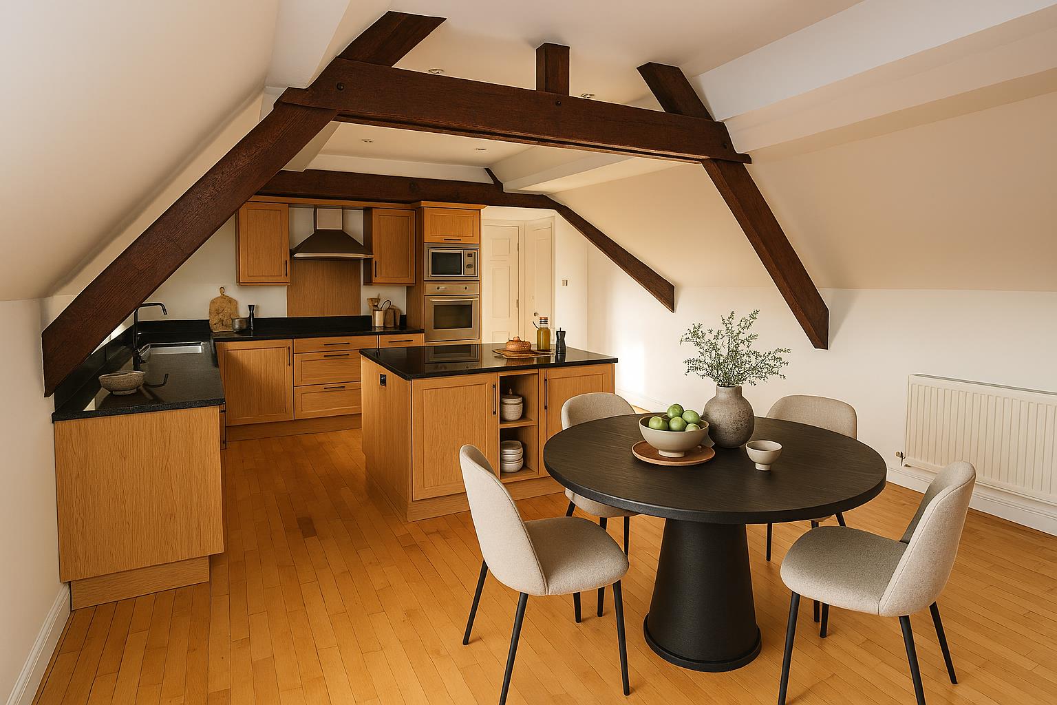 Triple aspect room with exposed timber beams, LED ceiling lights, storage cupboard, radiators, wood effect flooring.