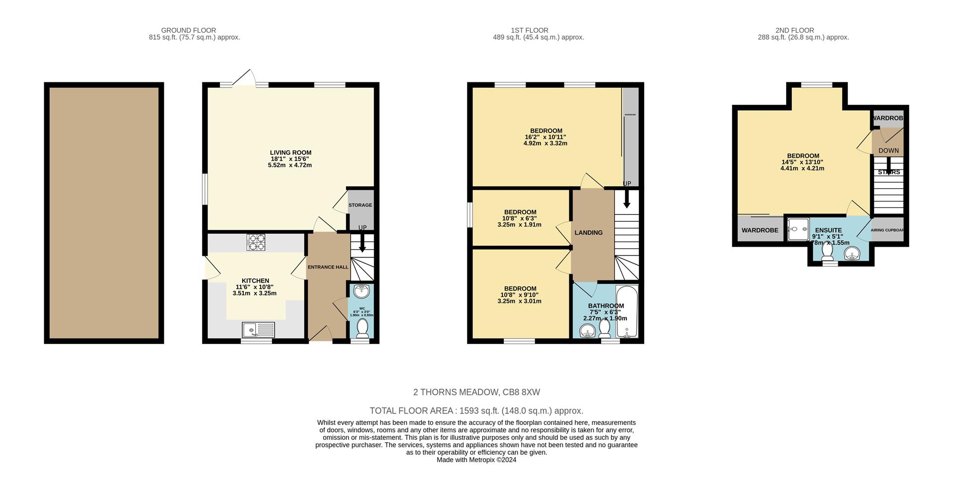 Modern en suite with white suite comprising low level W.C., pedestal hand basin with mixer tap over and splashback tiles and generous walk-in, fully tiled shower cubicle. Built-in generous airing-cupboard with wooden shelving. Tiled flooring. Velux window. Door to Master bedroom.