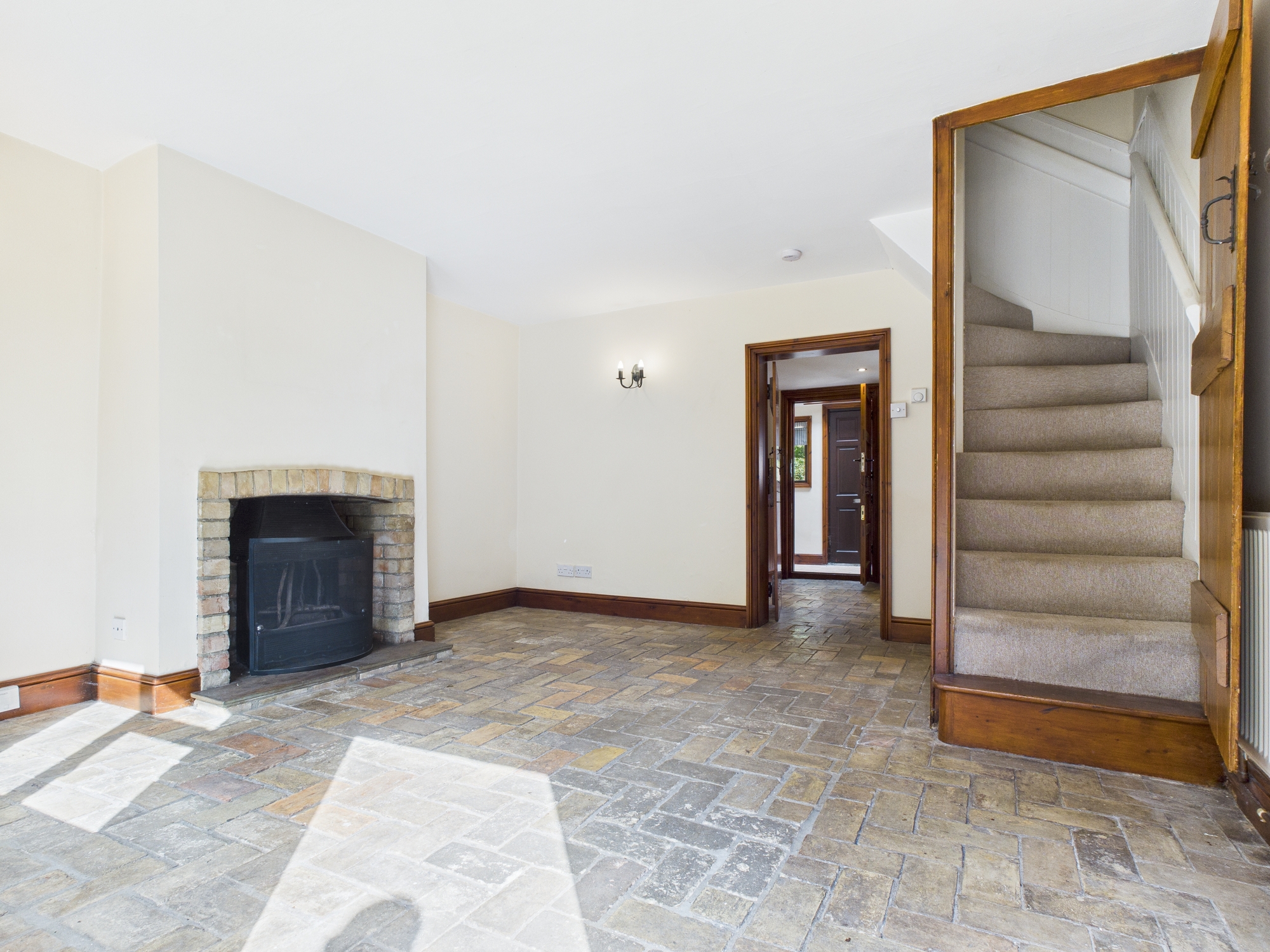 Wood framed window to the front aspect, wall mounted single panel radiator, brick surround chimney breast with open fire inset, door with stairs to first floor, understairs storage cupboard with lighting, character brick flooring, door to:-