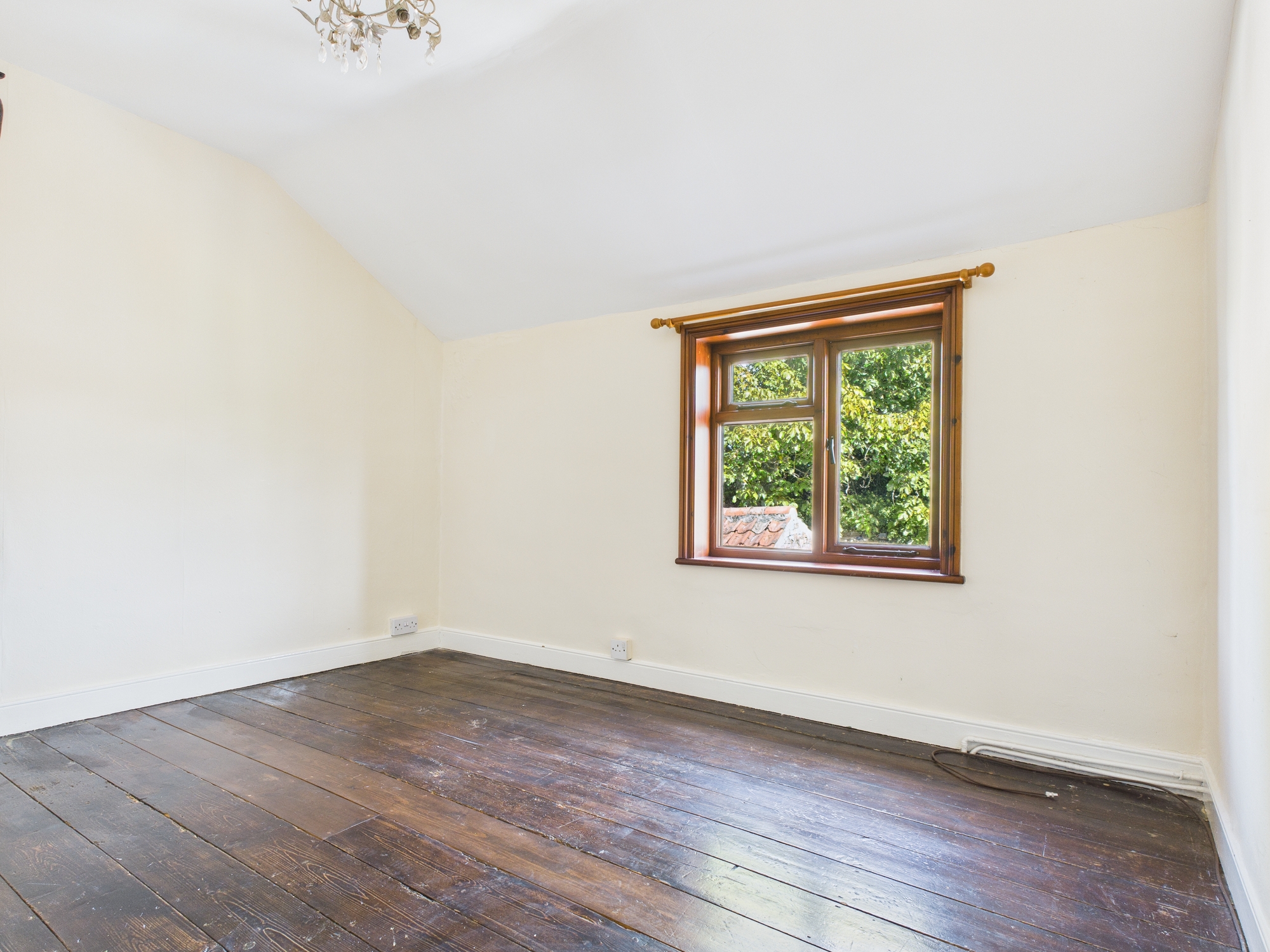 Wood framed window to the rear aspect, wall mounted single panel radiator, exposed wooden flooring.