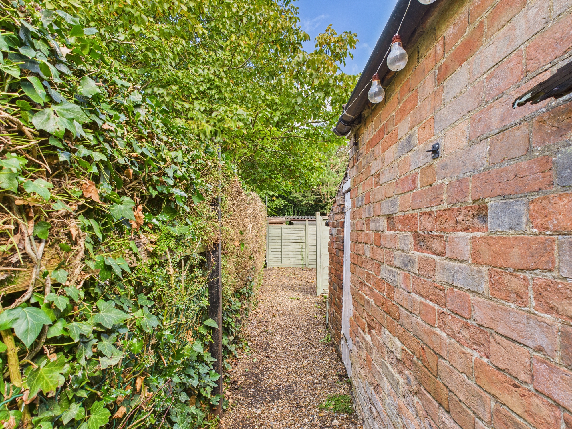 The front of the property is laid to shingle providing off road parking, the pathway to the side and rear is shared with neighbouring properties and gives access to the brick outbuilding and onto the private and spacious gardens with mature shrubs and trees and borders.