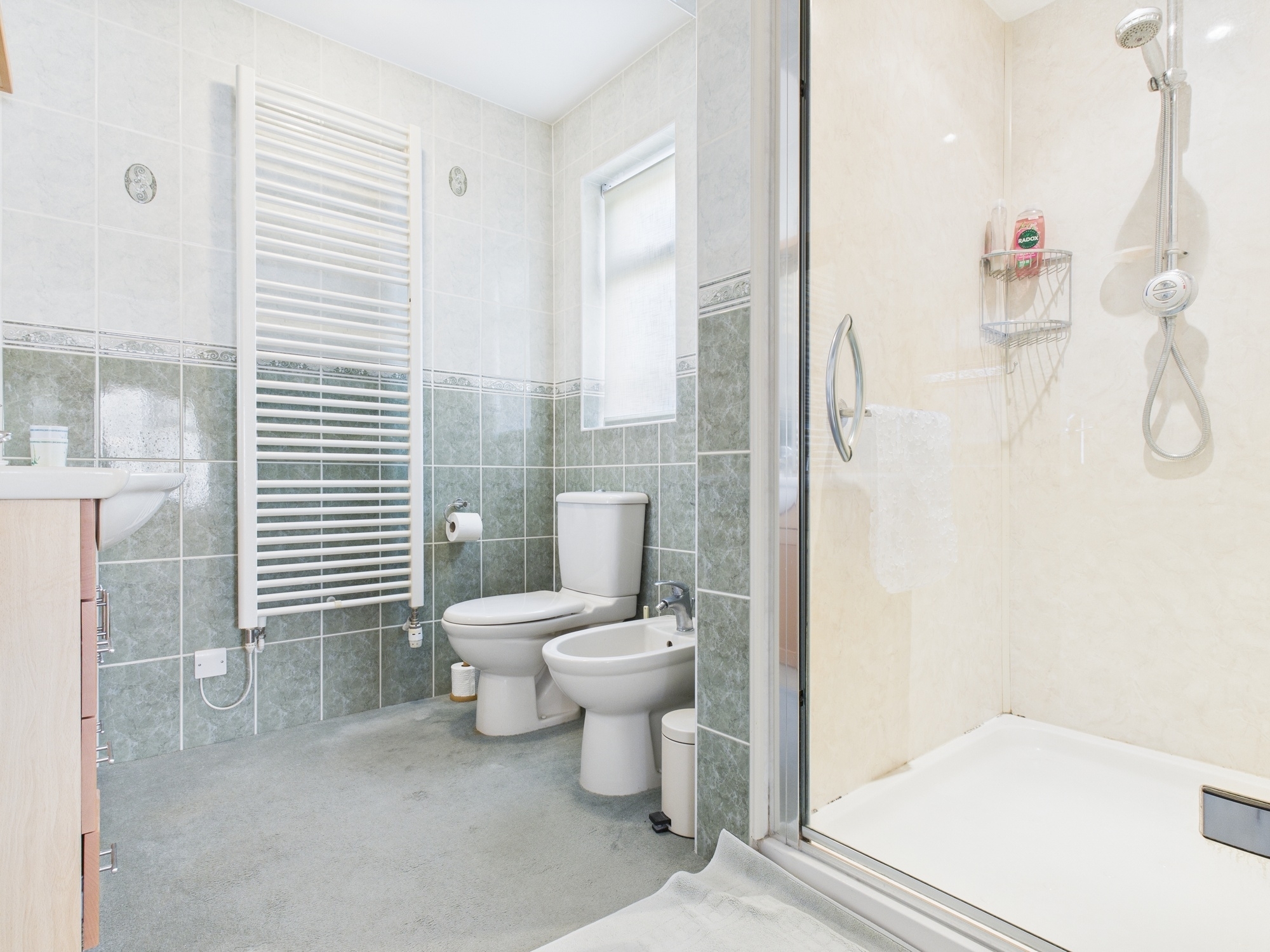 uPVC double glazed window to rear, wall mounted heated towel rail, shower cubicle with glass door, w.c., bidet, handwash basin inset to vanity unit with wall mounted mirror over, tiled walls, extractor.
