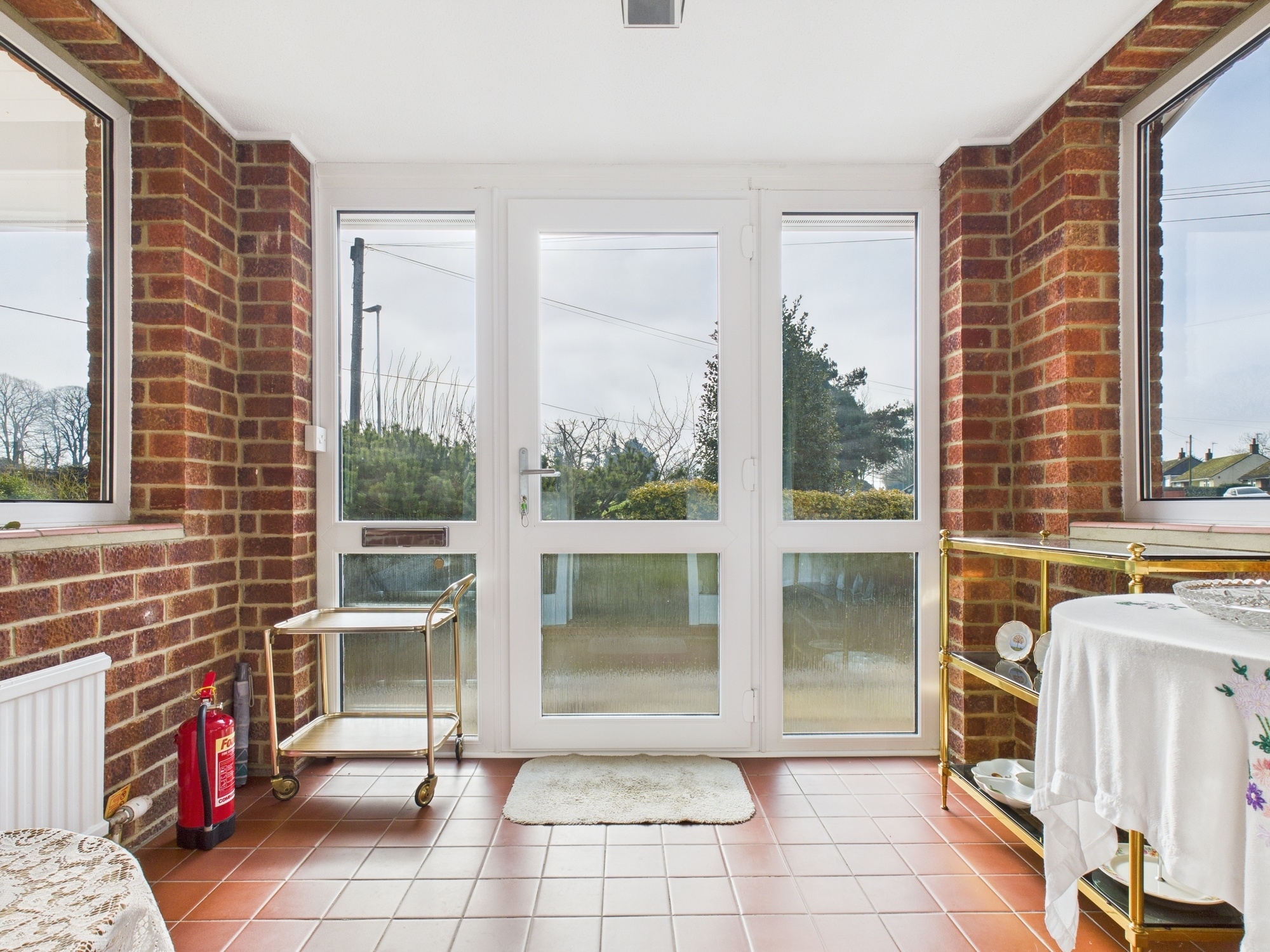 Wall mounted single panel radiator, uPVC double glazed windows to front and both sides, tiled flooring, part glazed door to:-