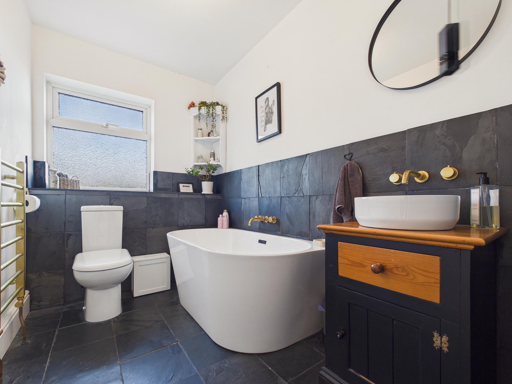 uPVC double glazed window to rear, wall mounted heated towel rail, free standing bath with central taps, w.c., handwash basin inset to storage cupboard, tiled flooring, partly tiled walls, double doors to storage cupboard.