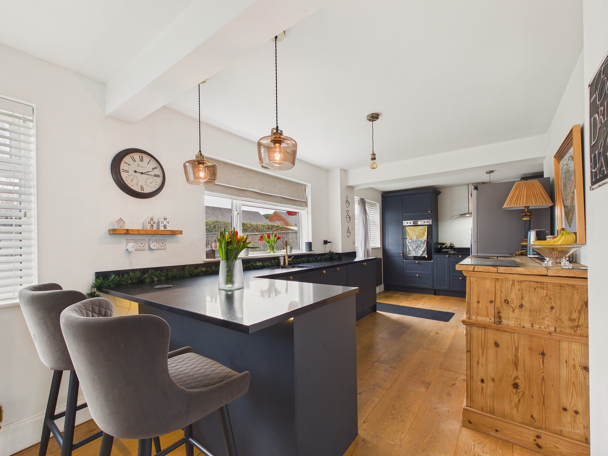 2 x uPVC double glazed window to rear, 2 x wall mounted radiators, uPVC double glazed door to rear, base units under granite worksurfaces with breakfast bar, butler sink inset with mixer tap over, integral dishwasher, 4 ring hob with extractor over, eye level double oven, space for fridge/freezer, wooden flooring, door to:-