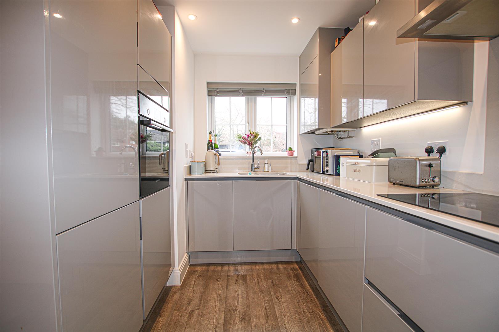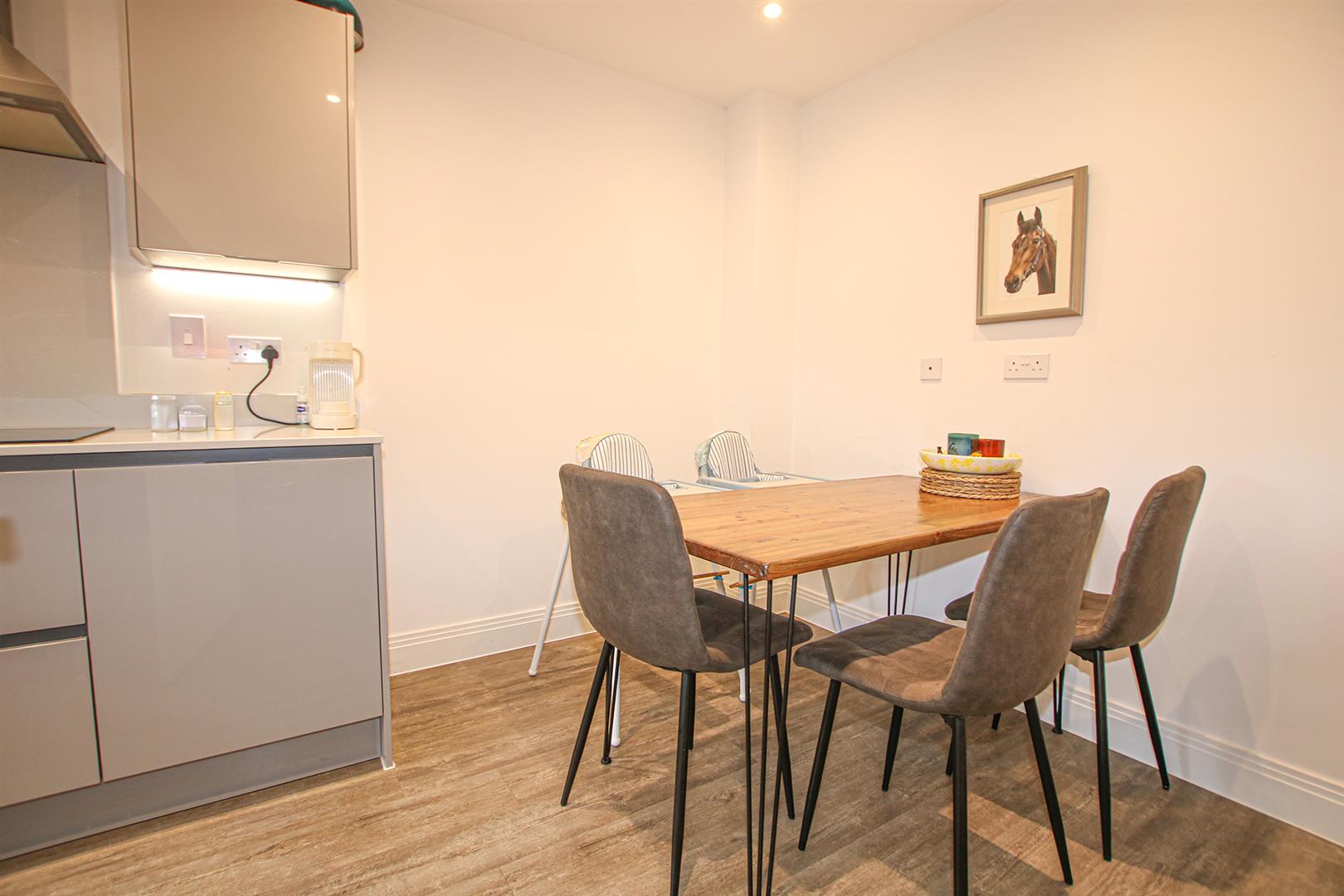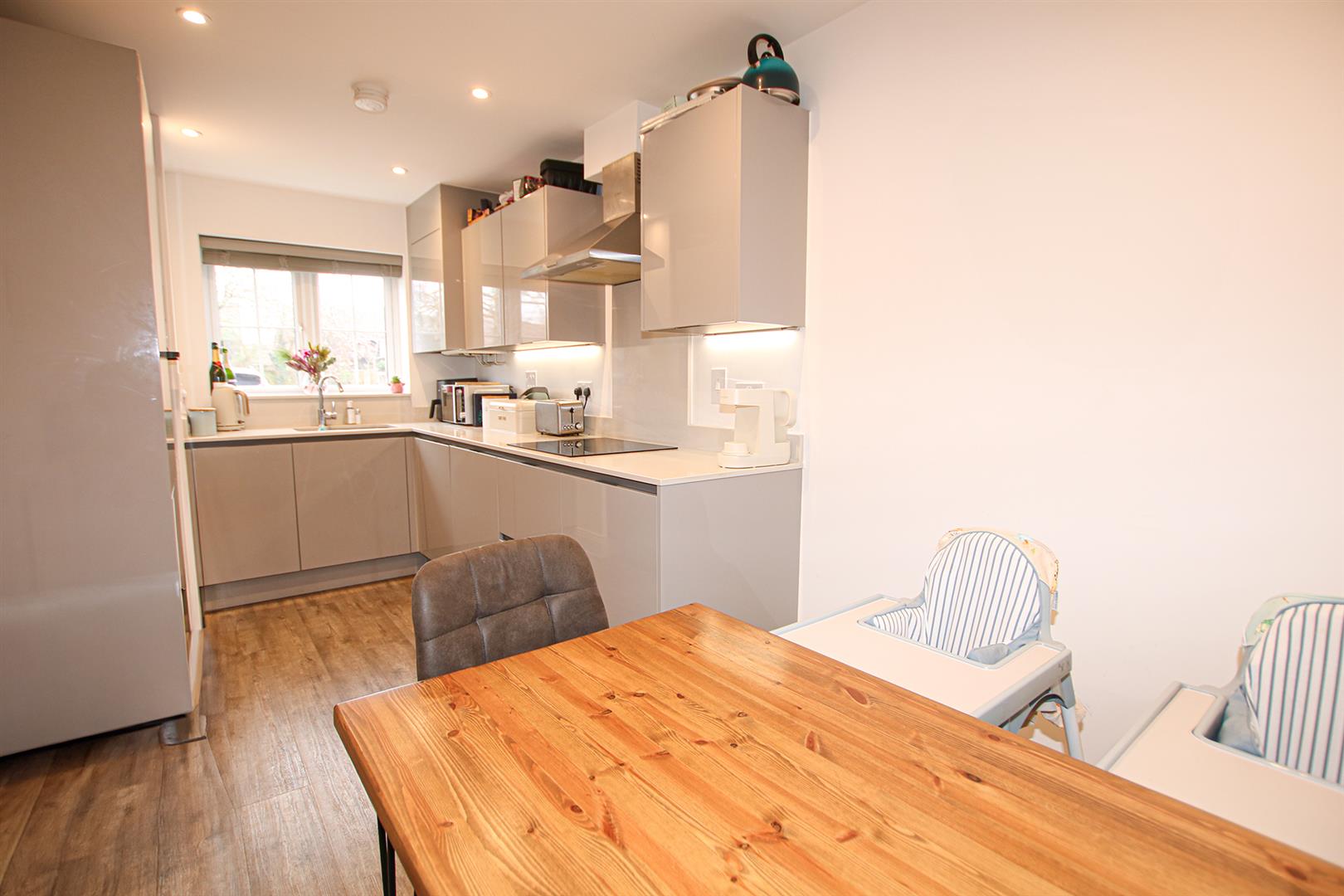 Contemporary kitchen/diner with a range of matching eye and base level cupboards with under lighting and granite work top over. Inset sink and drainer with mixer tap over. Integrated eye level oven. Inset hob with stainless steel extractor above. Integrated fridge/freezer, washing machine and dishwasher. LVT wood flooring. Window to the front aspect. Radiator. Door leading to the entrance hall.