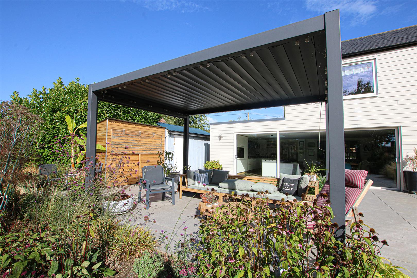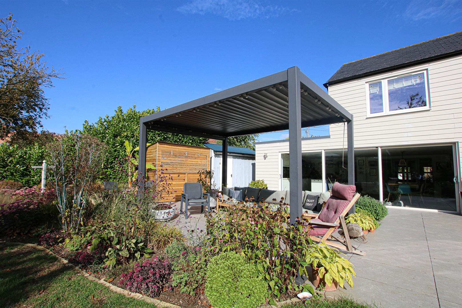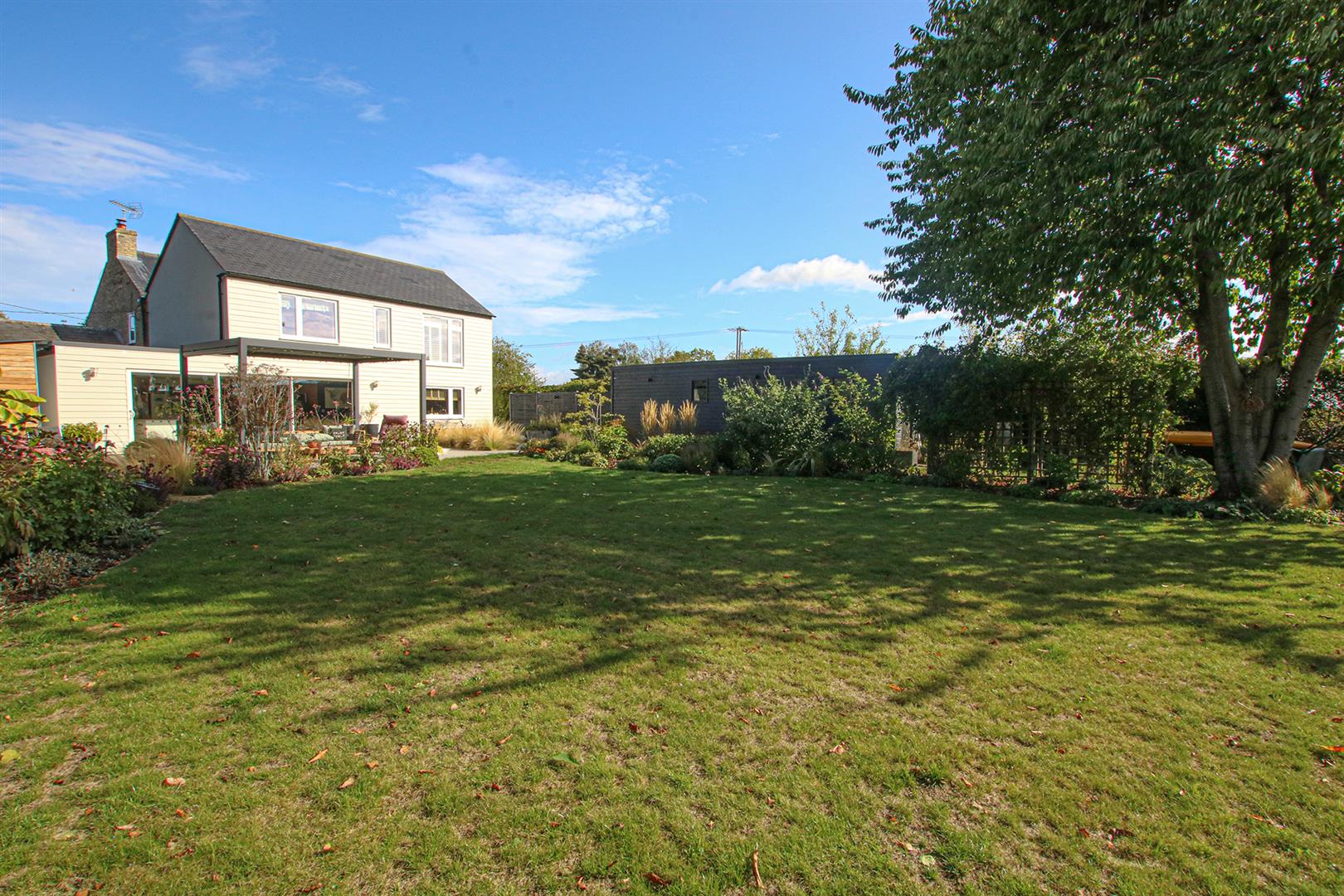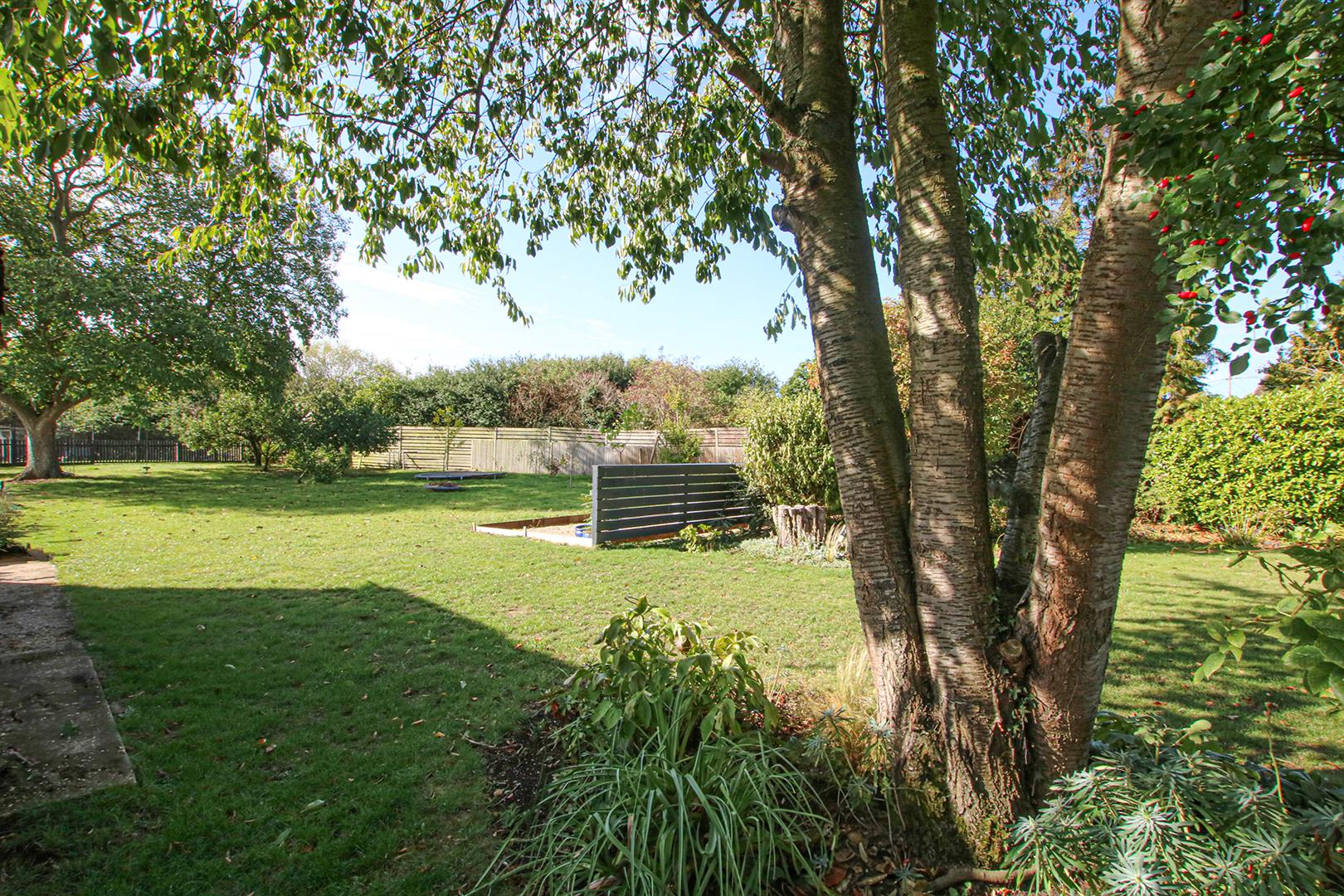 Spectacular landscaped garden. Ample laid to lawn space and extensive patio area with laid porcelain tiles, garden shed, a variety of well looked after trees, shrubs and flowers. Further down the garden is a enclosed chicken coop.