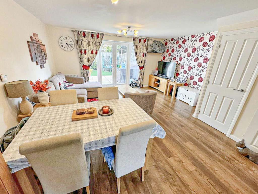 Spacious living/dining room with LVT wood flooring throughout. French doors leading to patio area. Opening to kitchen. Radiator. Door to understairs storage. Door to entrance hall.
