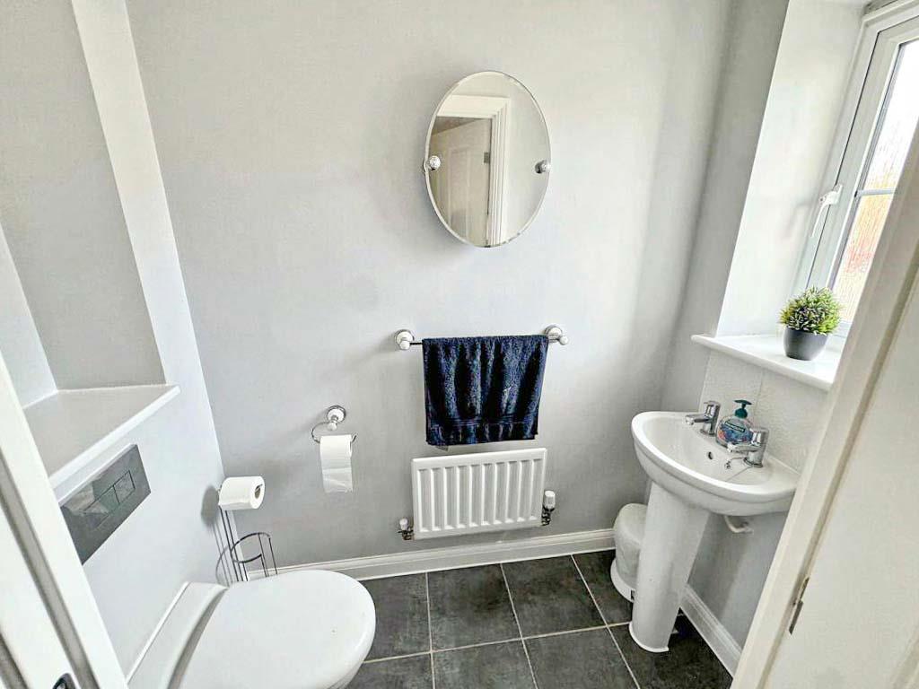 Modern white suite comprising low level, concealed cistern, W.C. and pedestal hand basin. Tiled flooring. Radiator. Obscured window. Door to entrance hall.