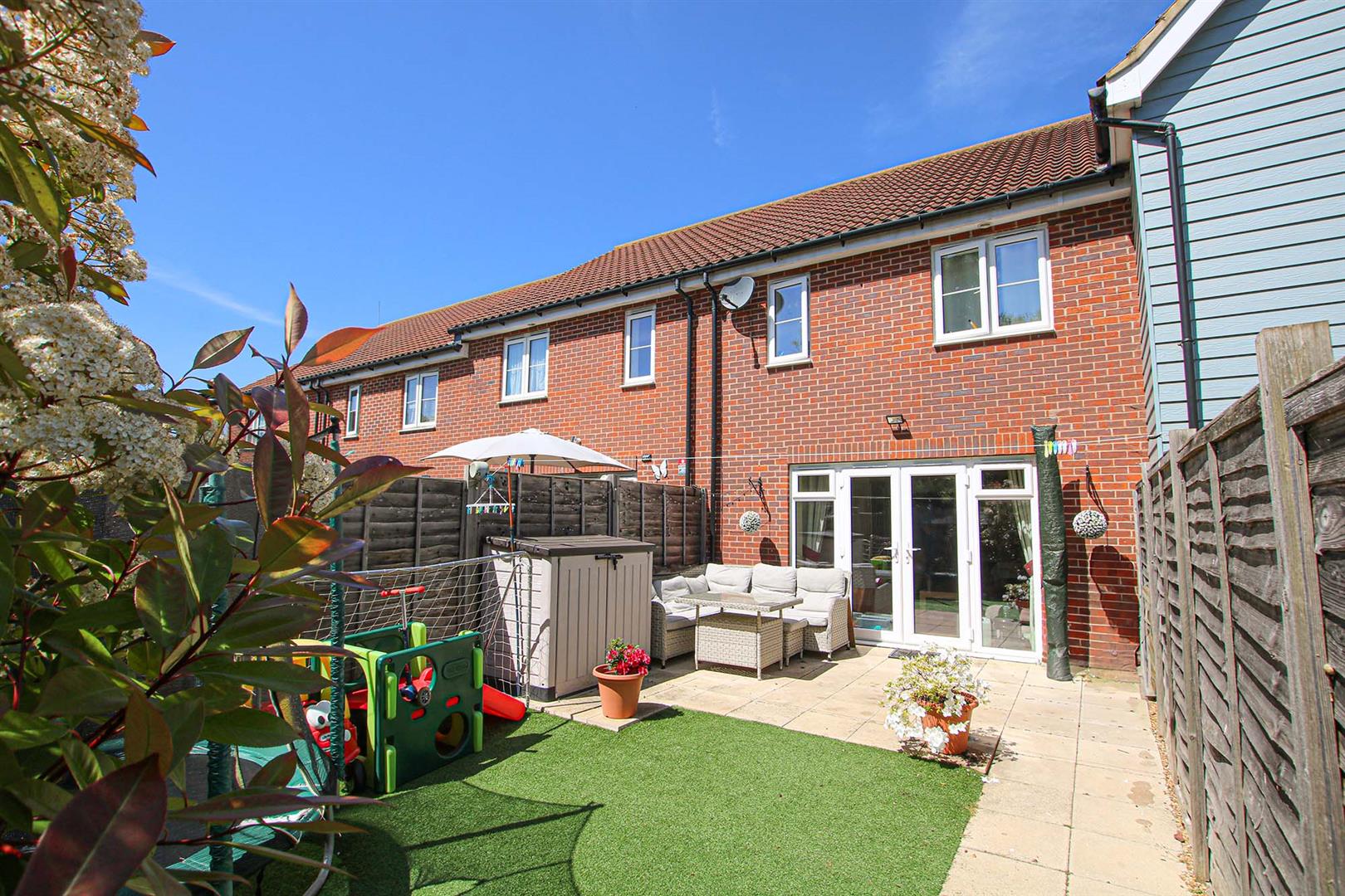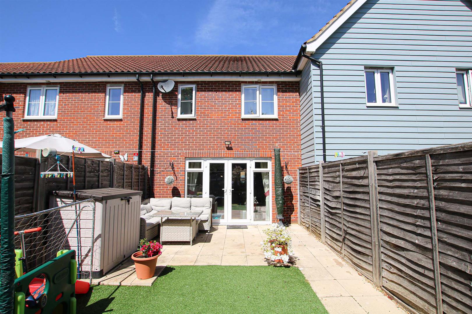 Well maintained family garden with patio area to rear of the house with French doors leading to living/dining room. Central faux grass area. Some mature shrub planting. Rear access gate to shared pathway.