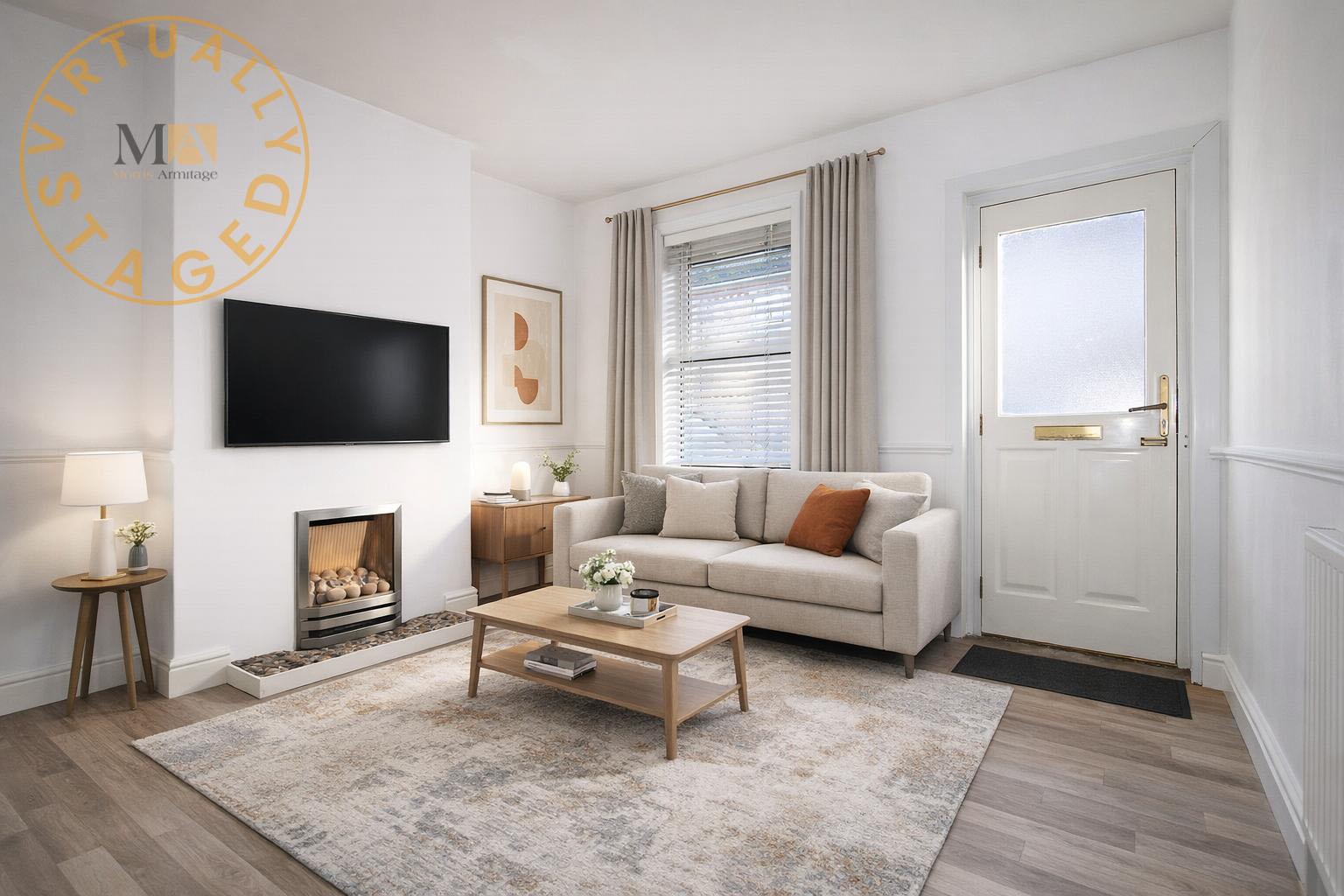 With window to rear aspect. Feature fire place (not in use). Under stairs storage cupboard with shelving. Radiator.