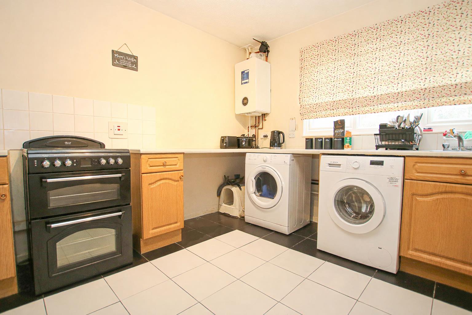 Fitted with a range of base and level cupboards with worktop over. Space and connection for a range style cooker. Space and plumbing for washing machine. Space for fridge/freezer. Stainless steel sink and drainer with mixer tap over. Tiled flooring. Large window to the front aspect. Door leading to the entrance hall.