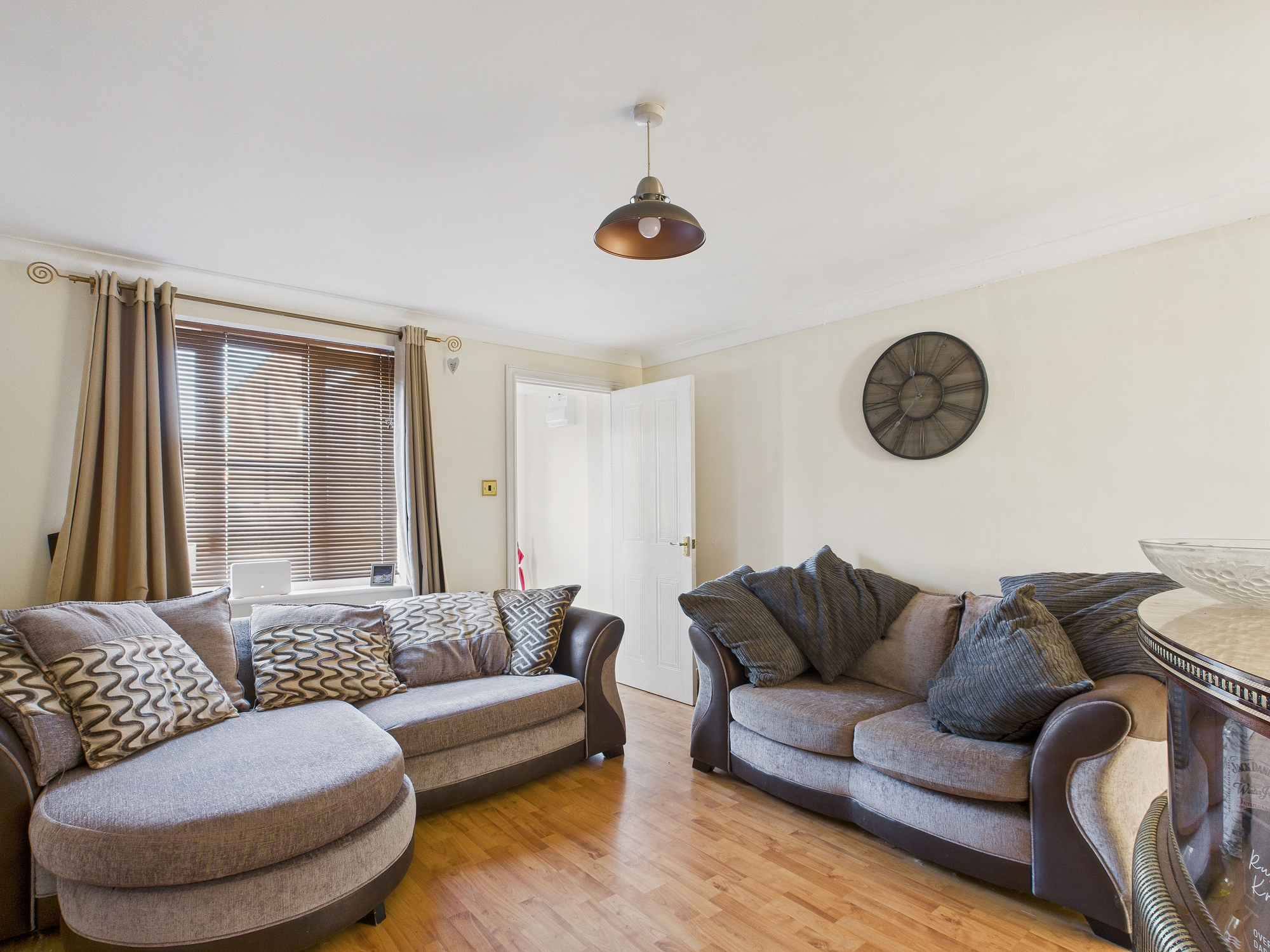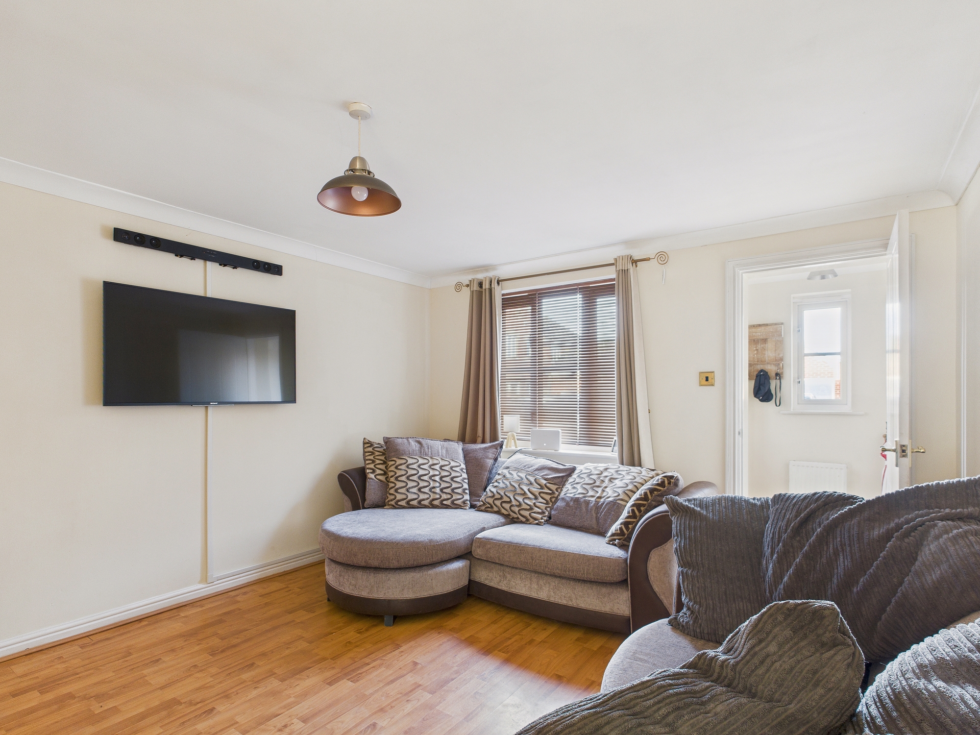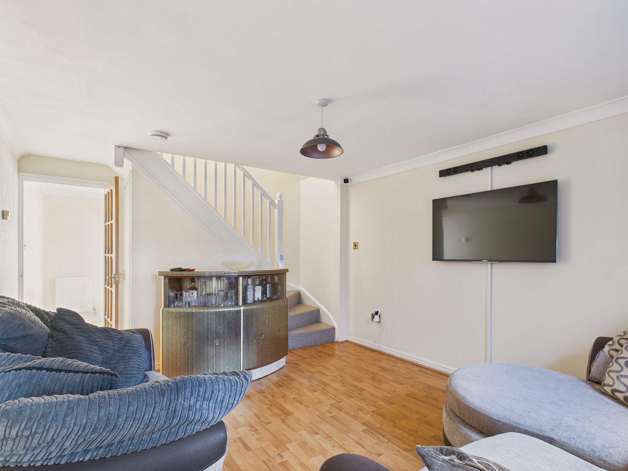 UPVC double glazed window to front aspect, laminate flooring, turning staircase to the first floor, coved ceiling, understairs storage cupboard, walk through to:-