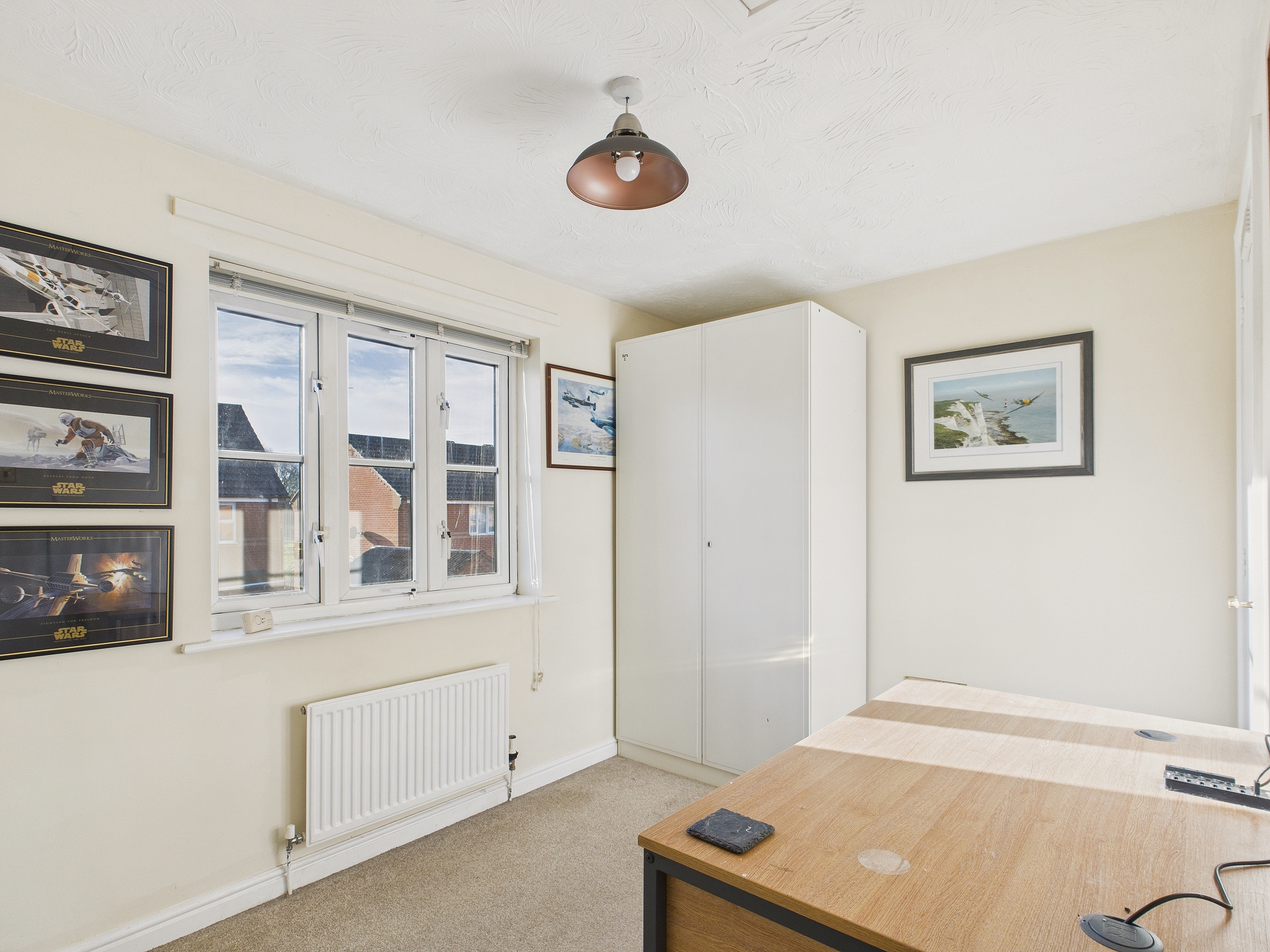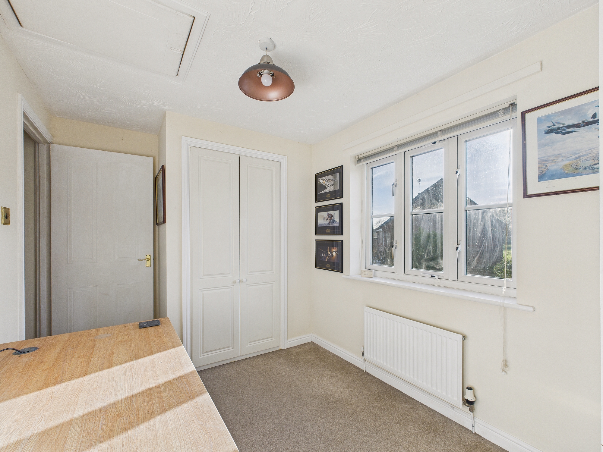 UPVC double glazed window to rear aspect, single panel radiator, double doors to built-in wardrobe, coved ceiling, door to storage cupboard housing gas central heating boiler.
