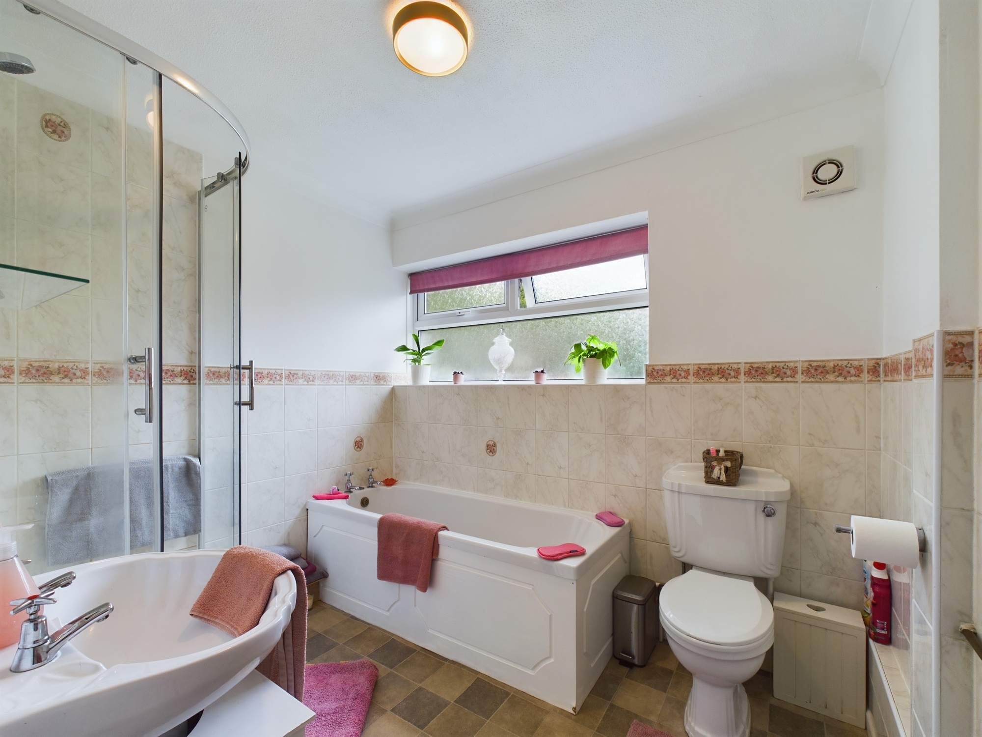 UPVC double glazed window to side aspect, wall mounted single panel radiator, panelled bath, corner shower cubicle, w.c., hand washbasin, lino style flooring, coved ceiling, extractor.