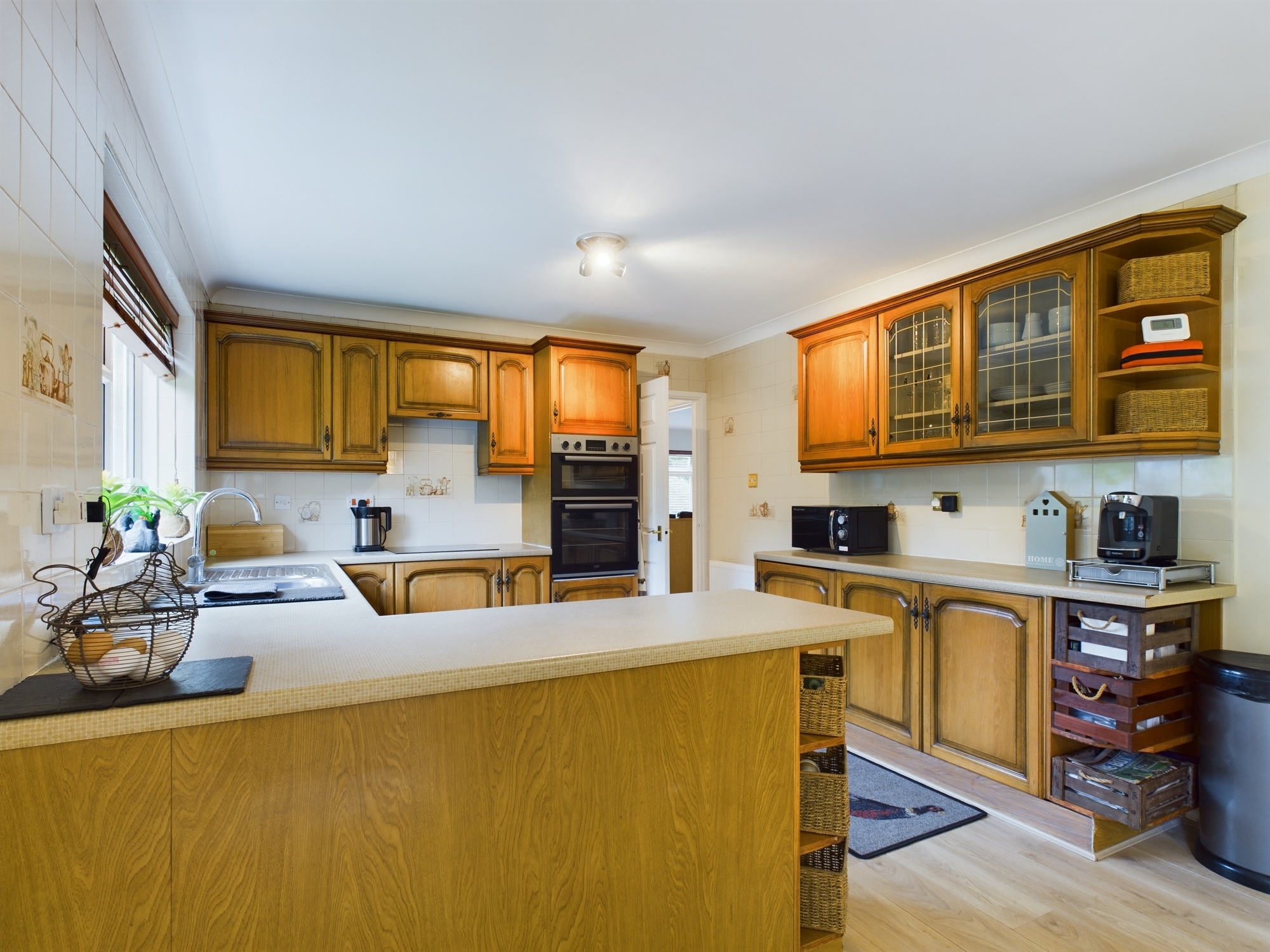 2 x uPVC double glazed window to side aspect, wall mounted single panel radiator, wall and base units under round edge worksurfaces, 1 1/2 stainless steel sink and drainer unit with mixer tap over, 4 ring induction hob with extractor, eye level double oven, laminate style flooring, coved ceiling, door to lounge, door to side entrance lobby.