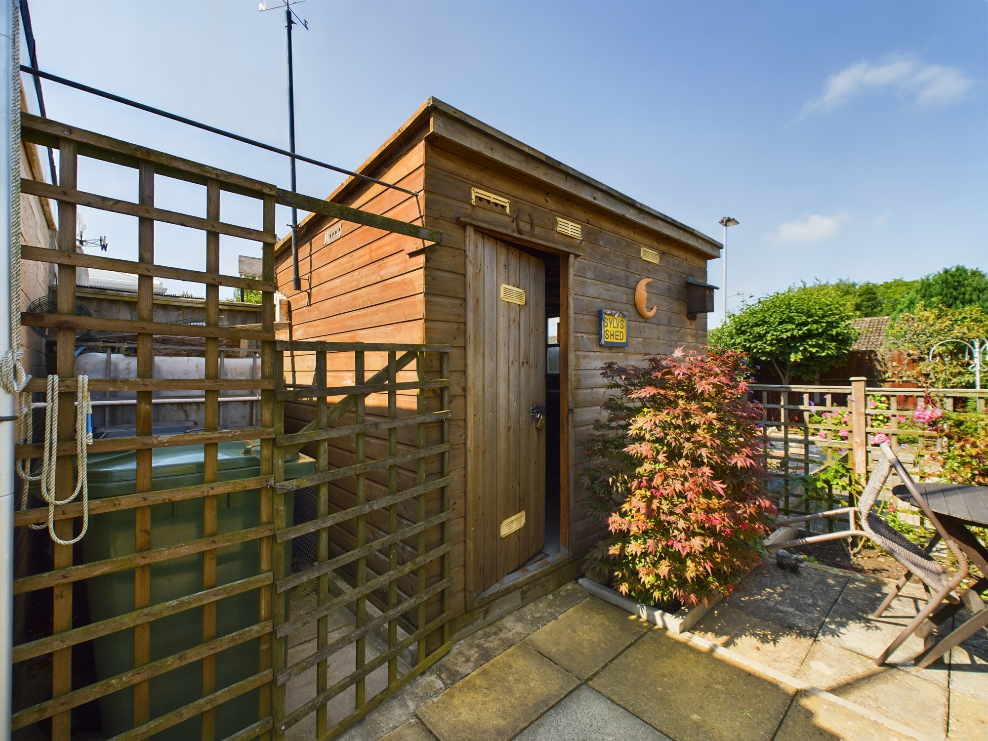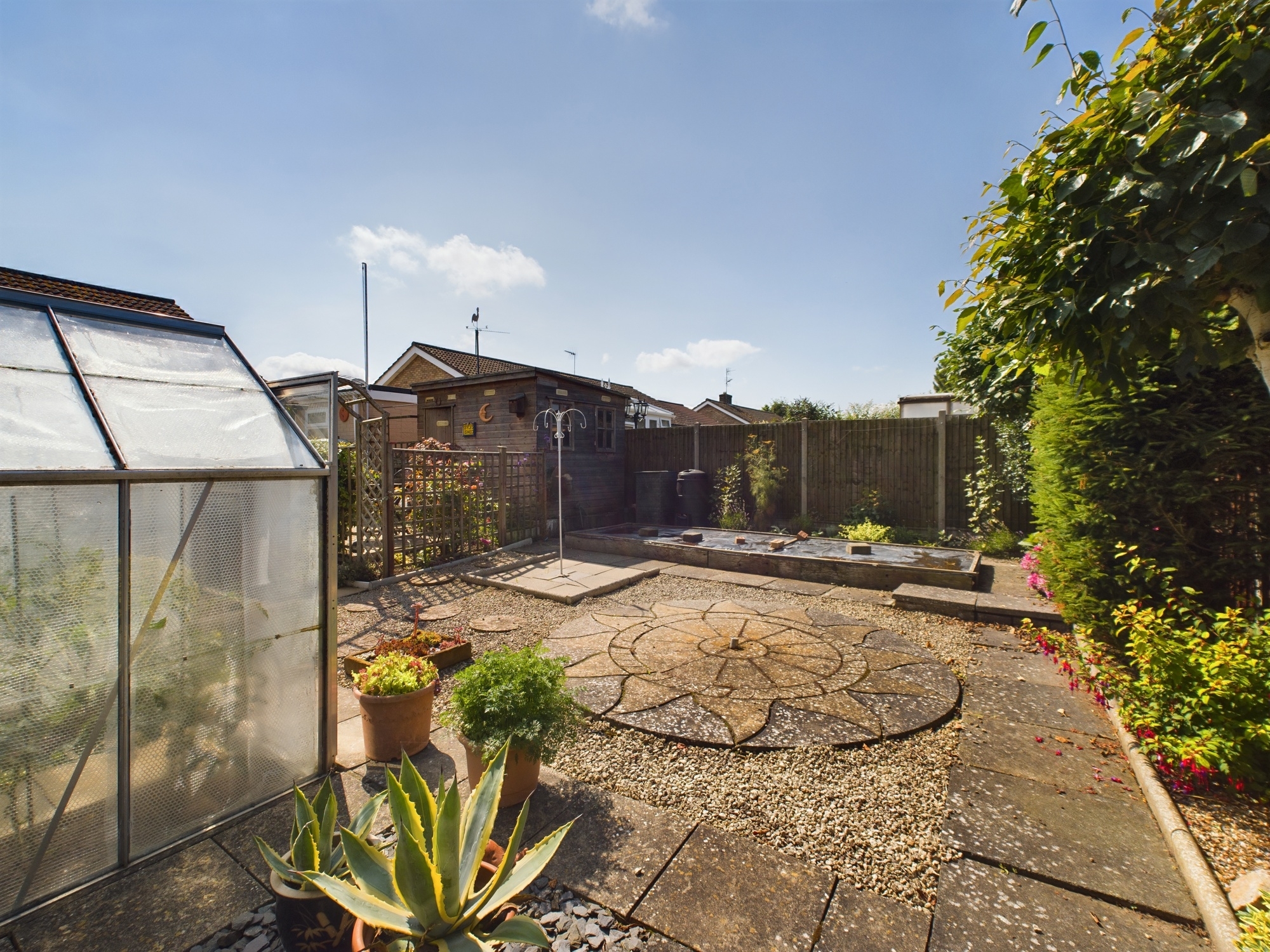 The rear garden has a patio and lawned areas with mature shrubs and plants. There are timber and further storage sheds, and also a greenhouse. To the front of the property, there is a shingle area with shrubs and trees. There is a driveway leading to the garage and entrance door.