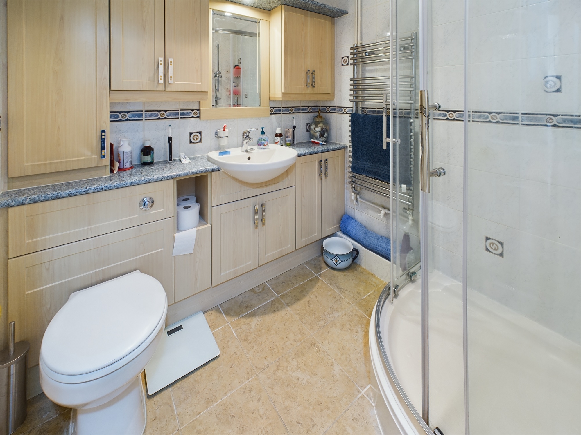 Corner shower cubicle, low level WC and wash basin set into vanity unit and storage, towel radiator, fully tiled walls and floor.