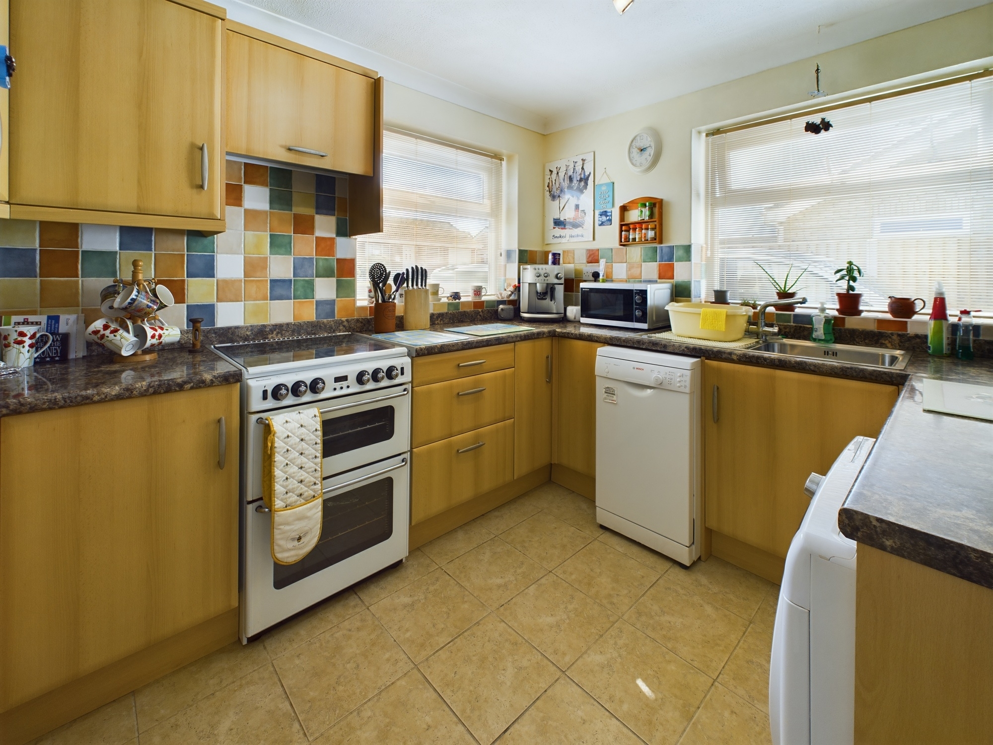 Matching wall and base units with worktop over, stainless steel sink and drainer, freestanding cooker, washing machine, extractor fan, uPVC double glazed windows to front and side, tiled flooring, slimline dishwasher, radiator.