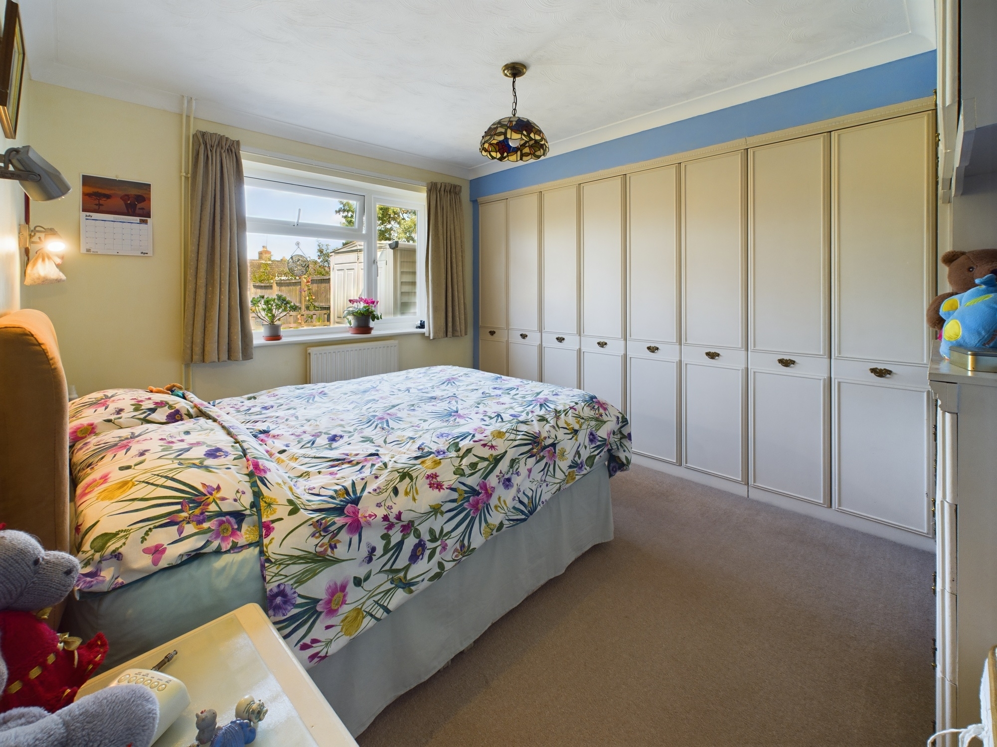 Fitted wardrobes and drawer units, radiator, uPVC double glazed window to rear.
