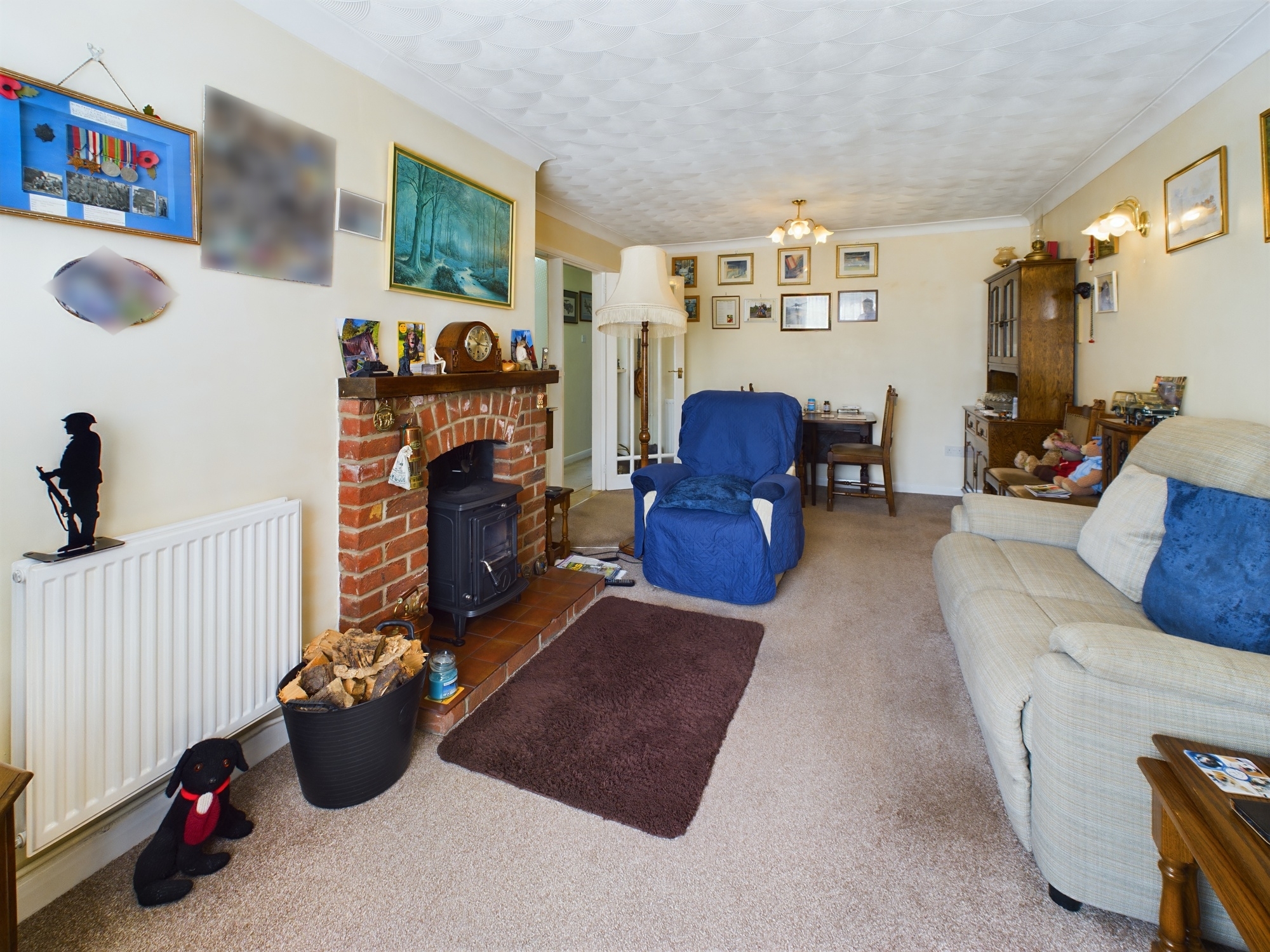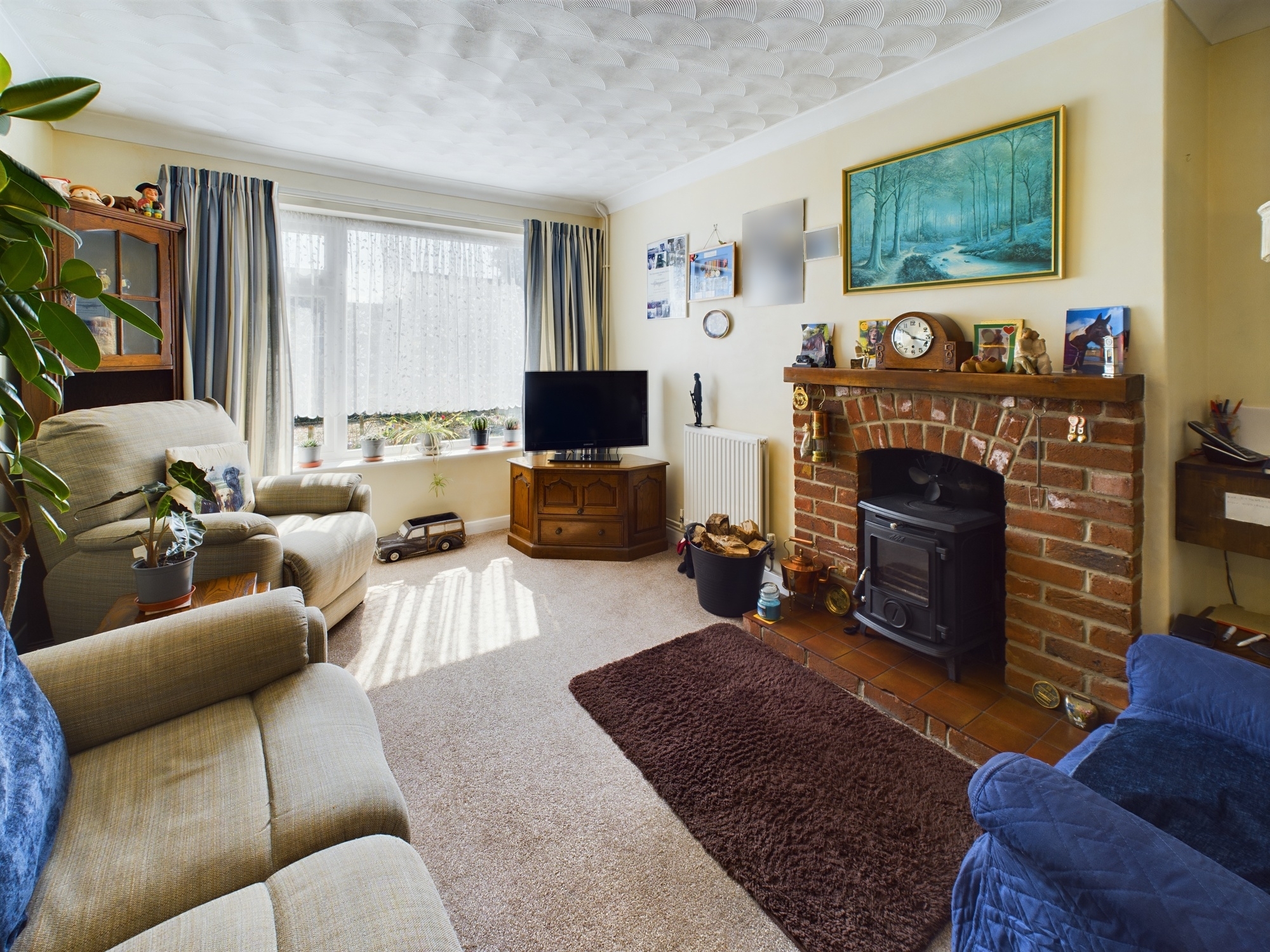 Multi fuel burner set in chimney breast with brick surround, two radiator, uPVC double glazed window to front.