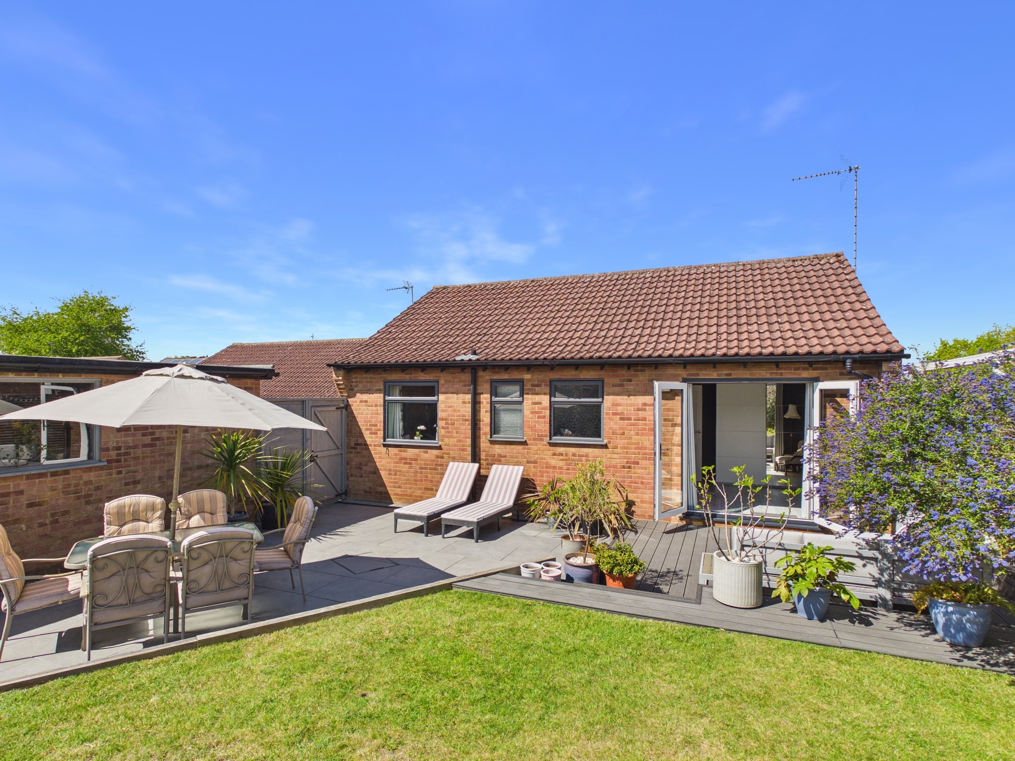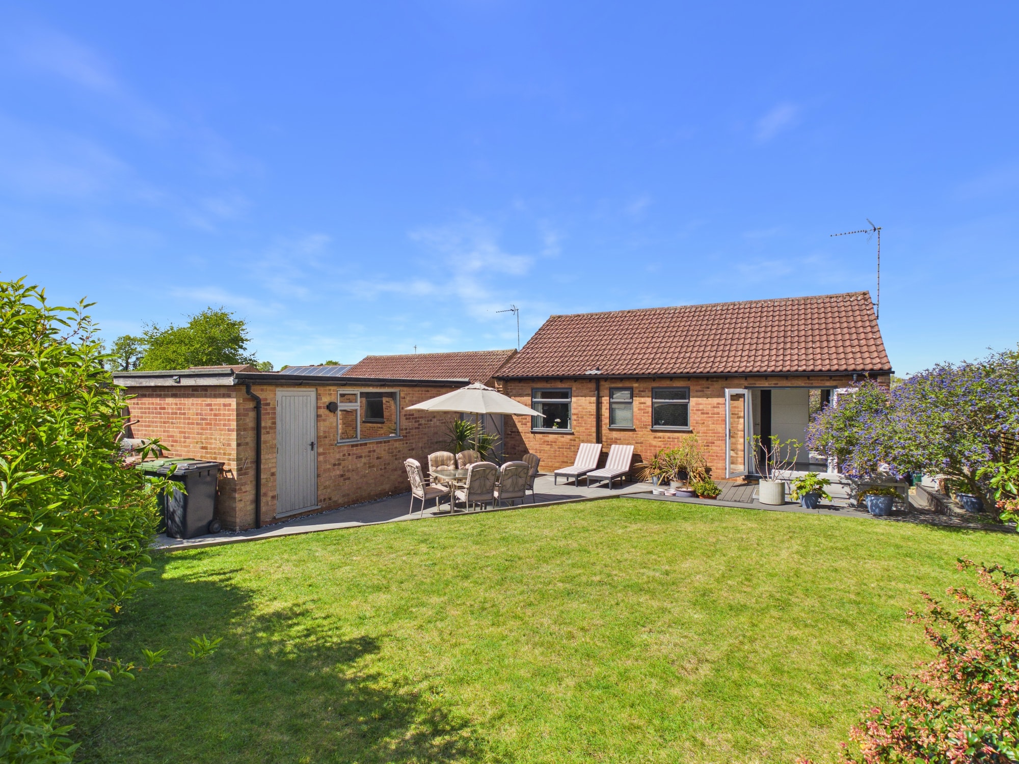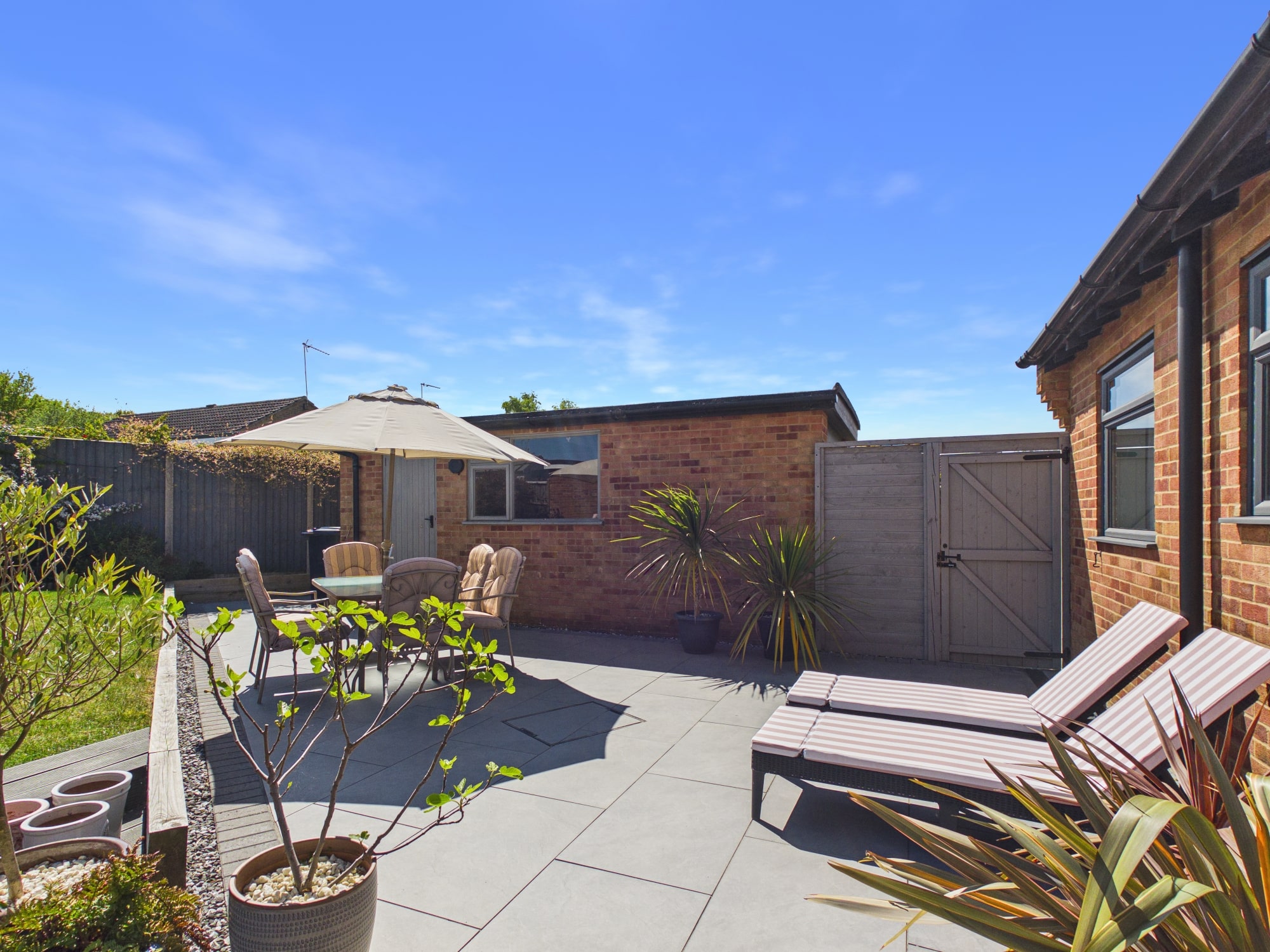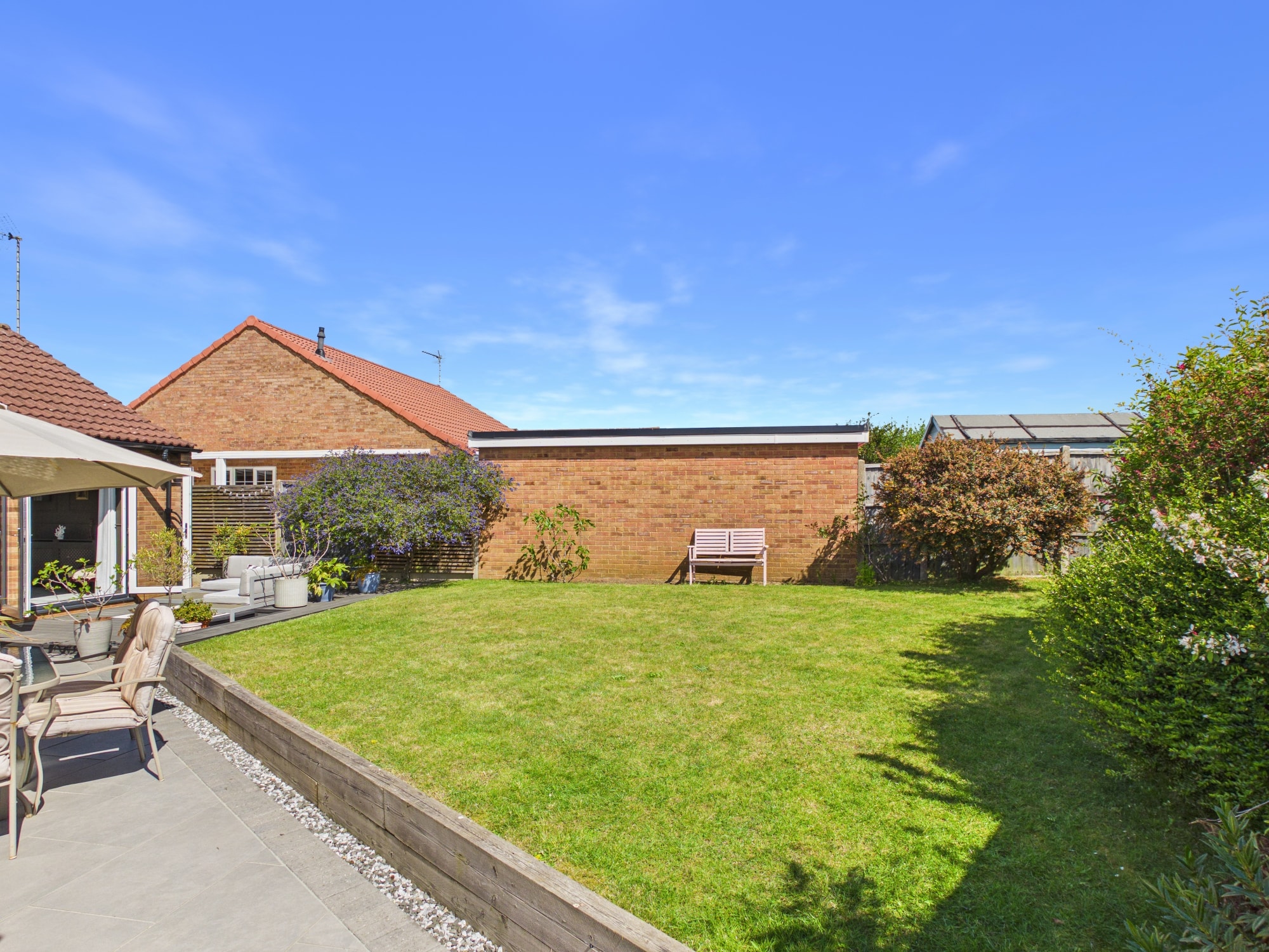 The front of the property is mainly laid to lawn with a driveway allowing for off road parking and leads to the garage. To the rear of the property there is a mixture of patio, lawned and decked areas with mature shrub borders, there is also gated access along with a personal door to the garage.