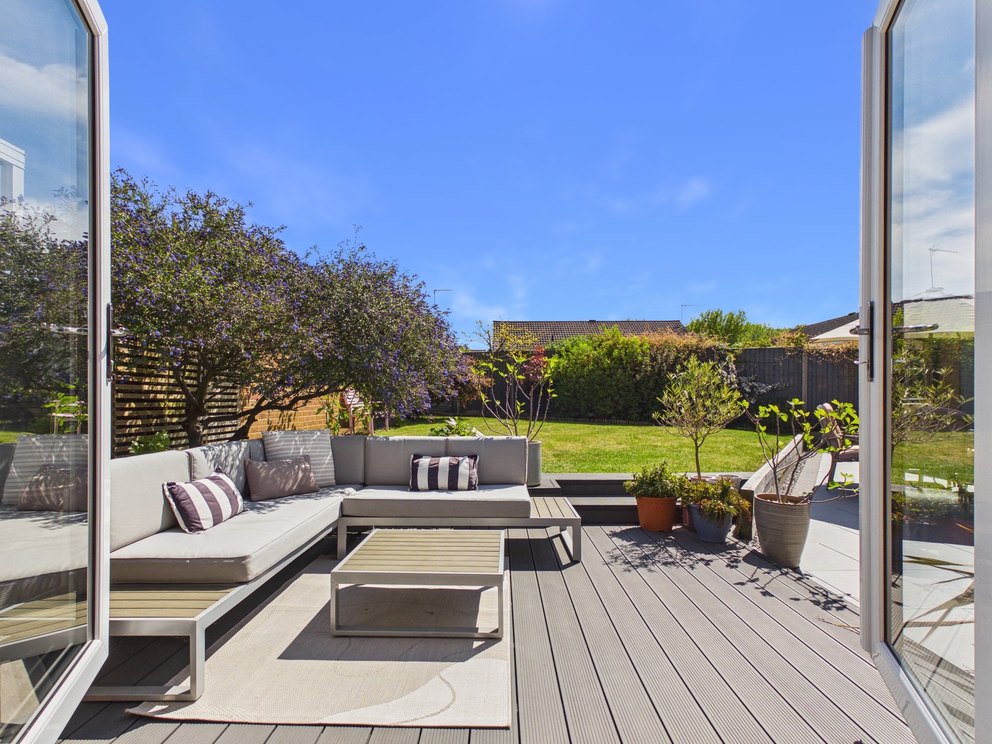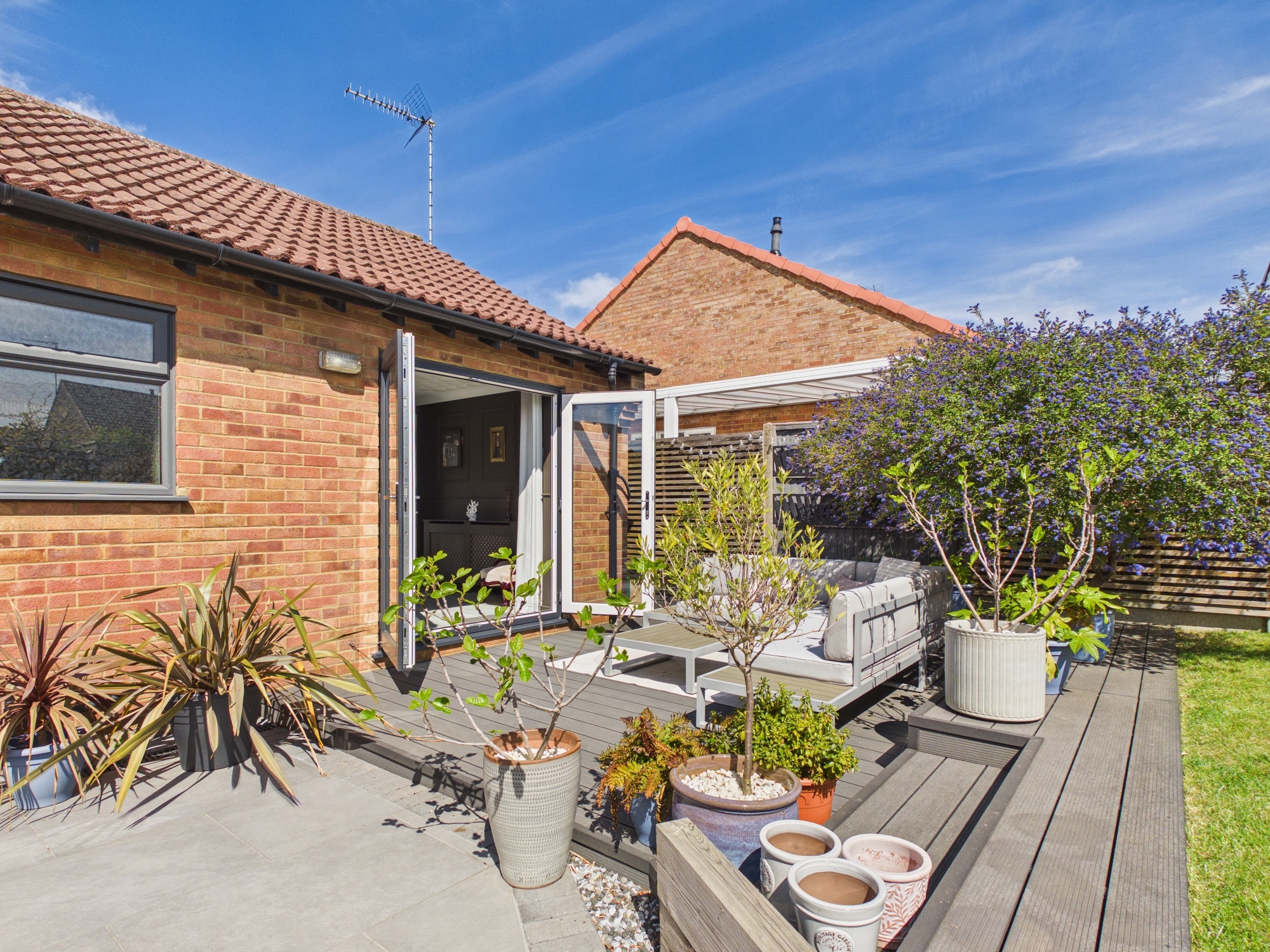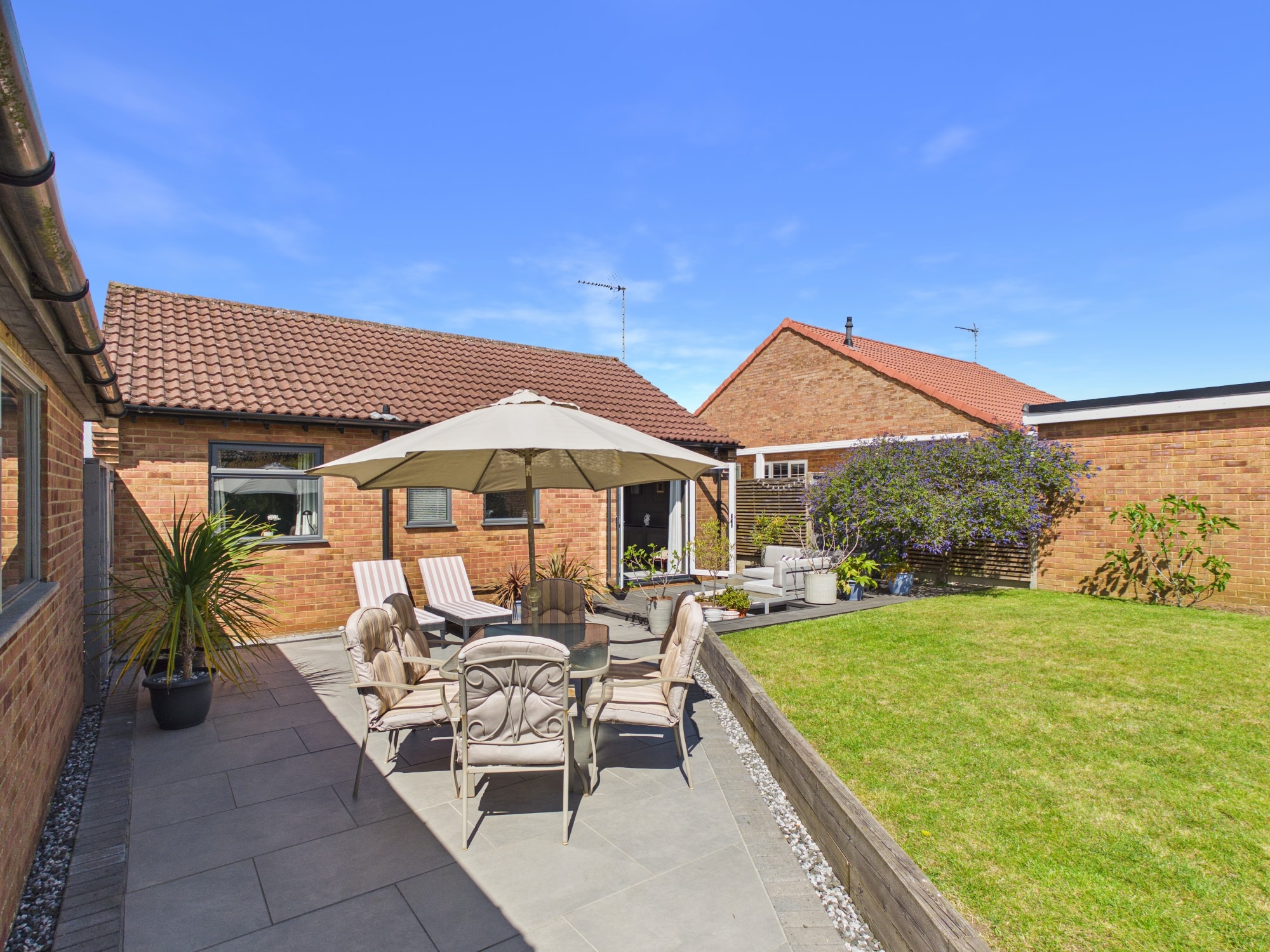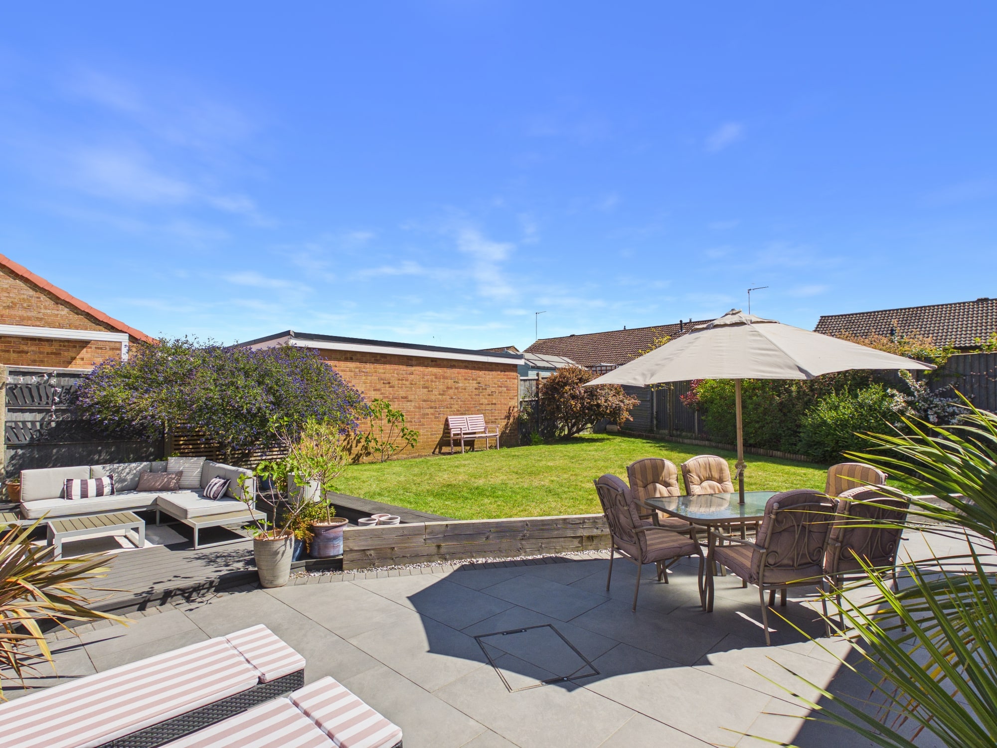 The front of the property is mainly laid to lawn with a driveway allowing for off road parking and leads to the garage. To the rear of the property there is a mixture of patio, lawned and decked areas with mature shrub borders, there is also gated access along with a personal door to the garage.