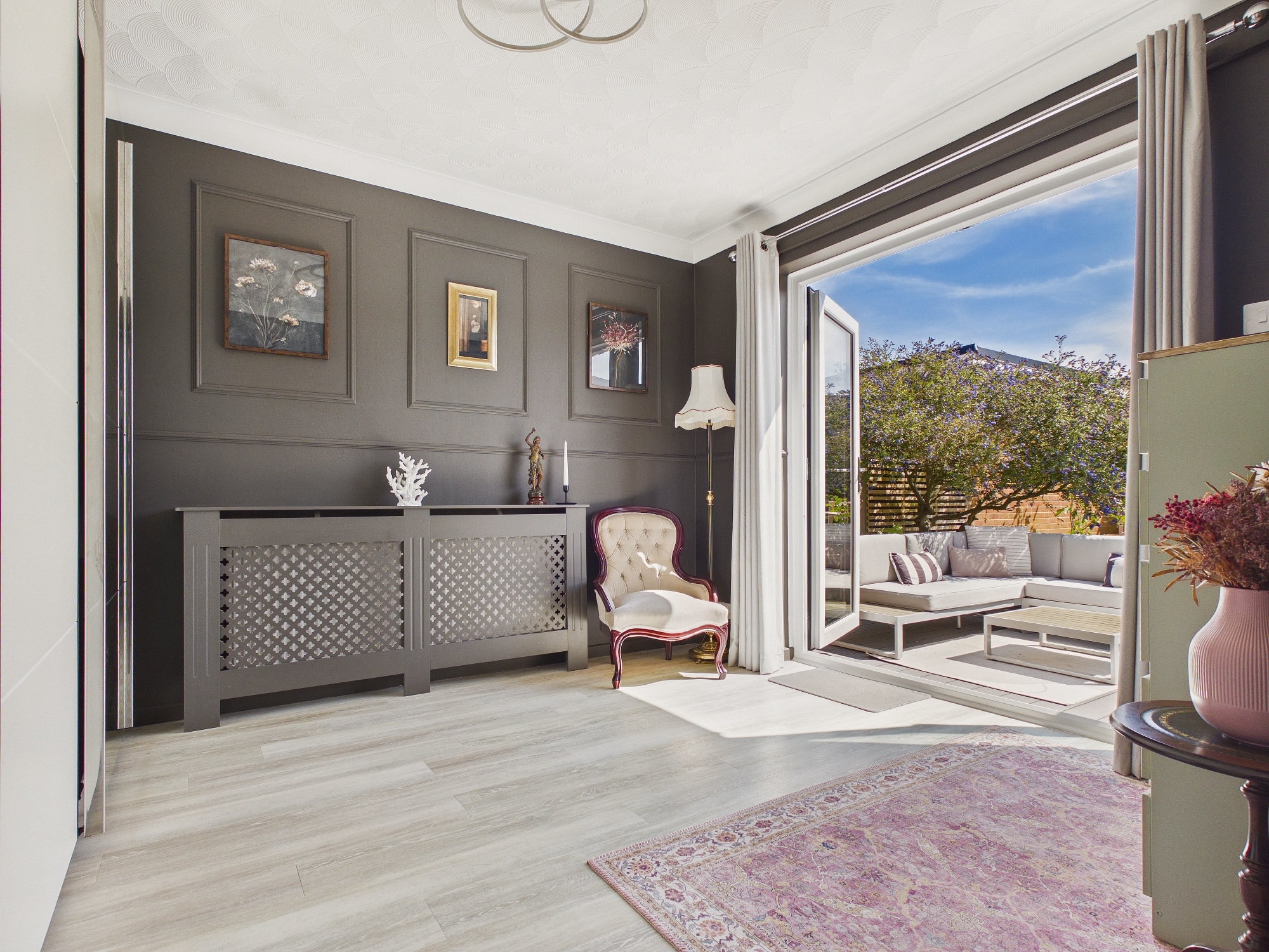 Wall mounted radiator, uPVC double glazed French doors to garden.