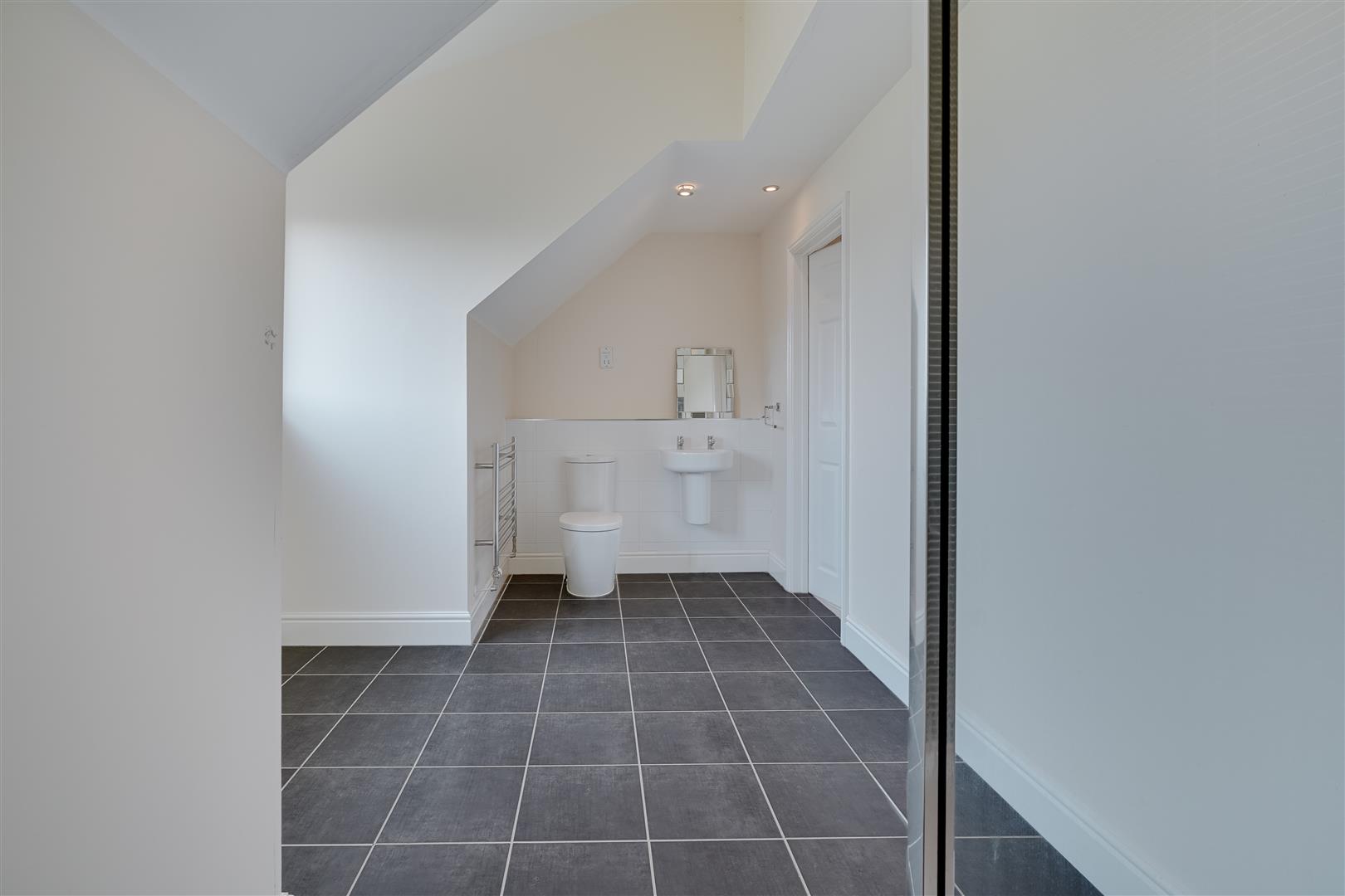 Spacious, contemporary en suite with white suite comprising low level W.C., wall mounted hand basin and generous walk-in shower. Attractively tiled to wet areas. Tiled flooring. Ladder radiator. Obscured window. Door to Master bedroom.