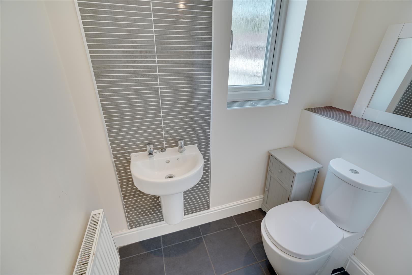 Contemporary white suite comprising low level W.C. and wall mounted hand basin with attractively tiled splashback. Tiled flooring. Radiator. Obscured window. Door to utility room.