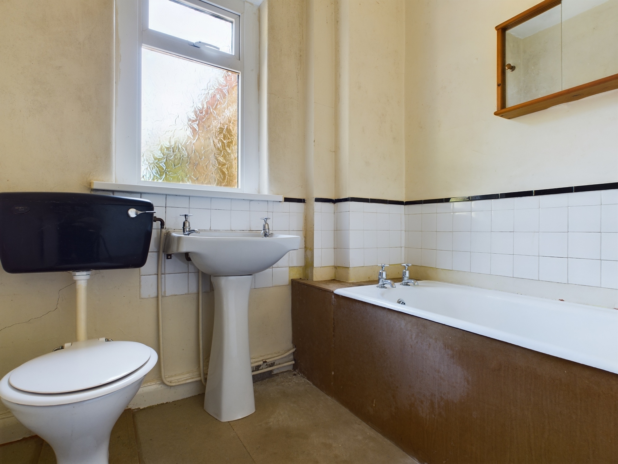 uPVC double glazed window to rear, wall mounted single panel radiator, bath, pedestal hand wash basin, WC.
